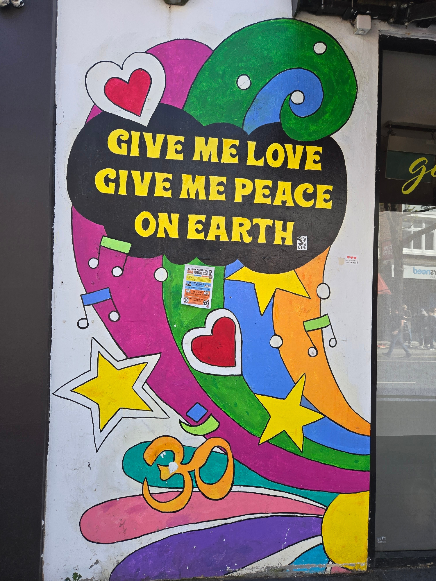 Here is a description of the image: This is a photograph of a colorful mural on a white wall. The mural features a psychedelic design with swirling shapes, stars, hearts, and musical notes in bright…read more