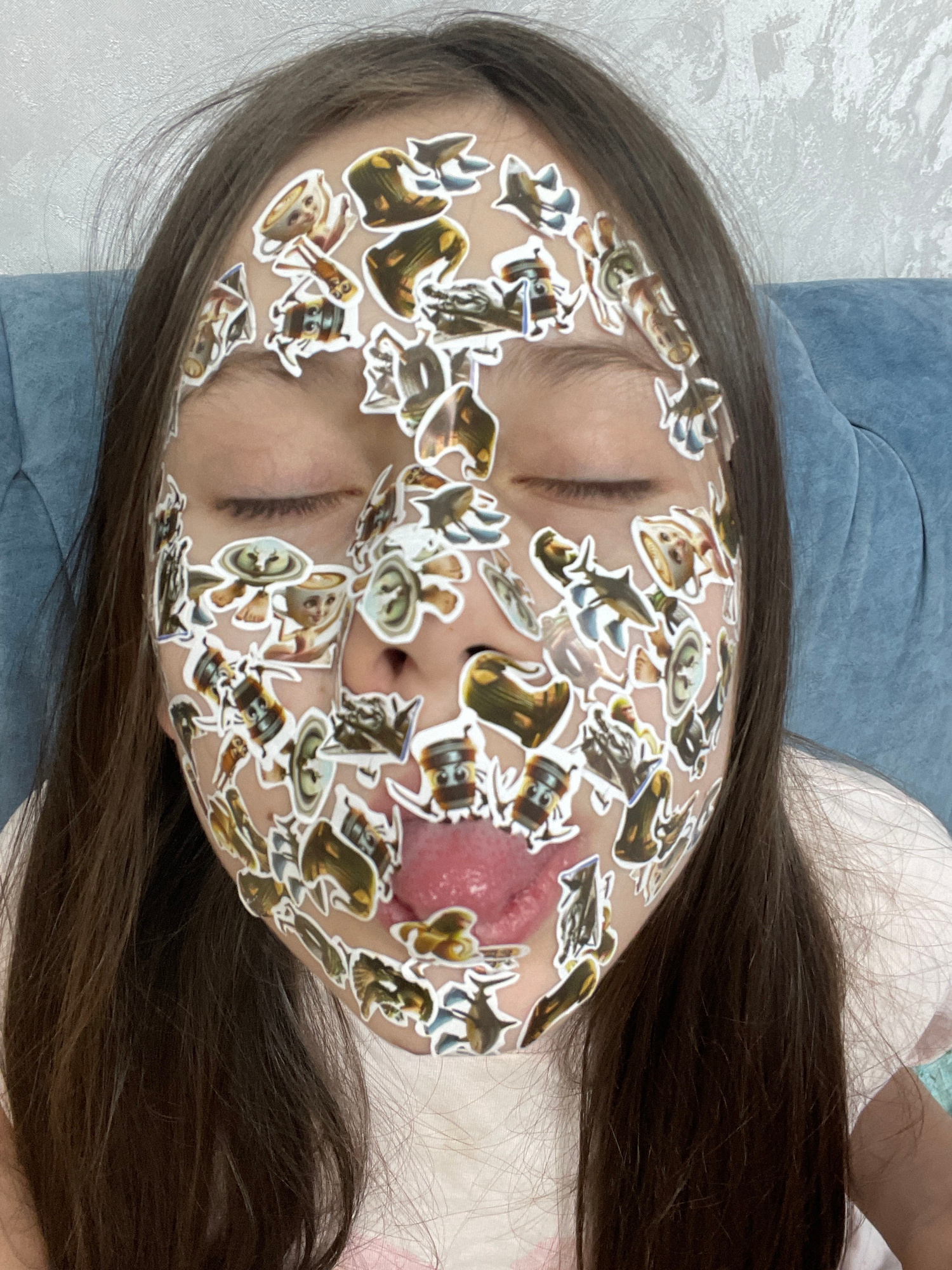 A young individual is lying down, with stickers covering their face. Their eyes are closed, and their tongue is slightly out. The background includes bedding and a blue cushion. No information indicat…read more