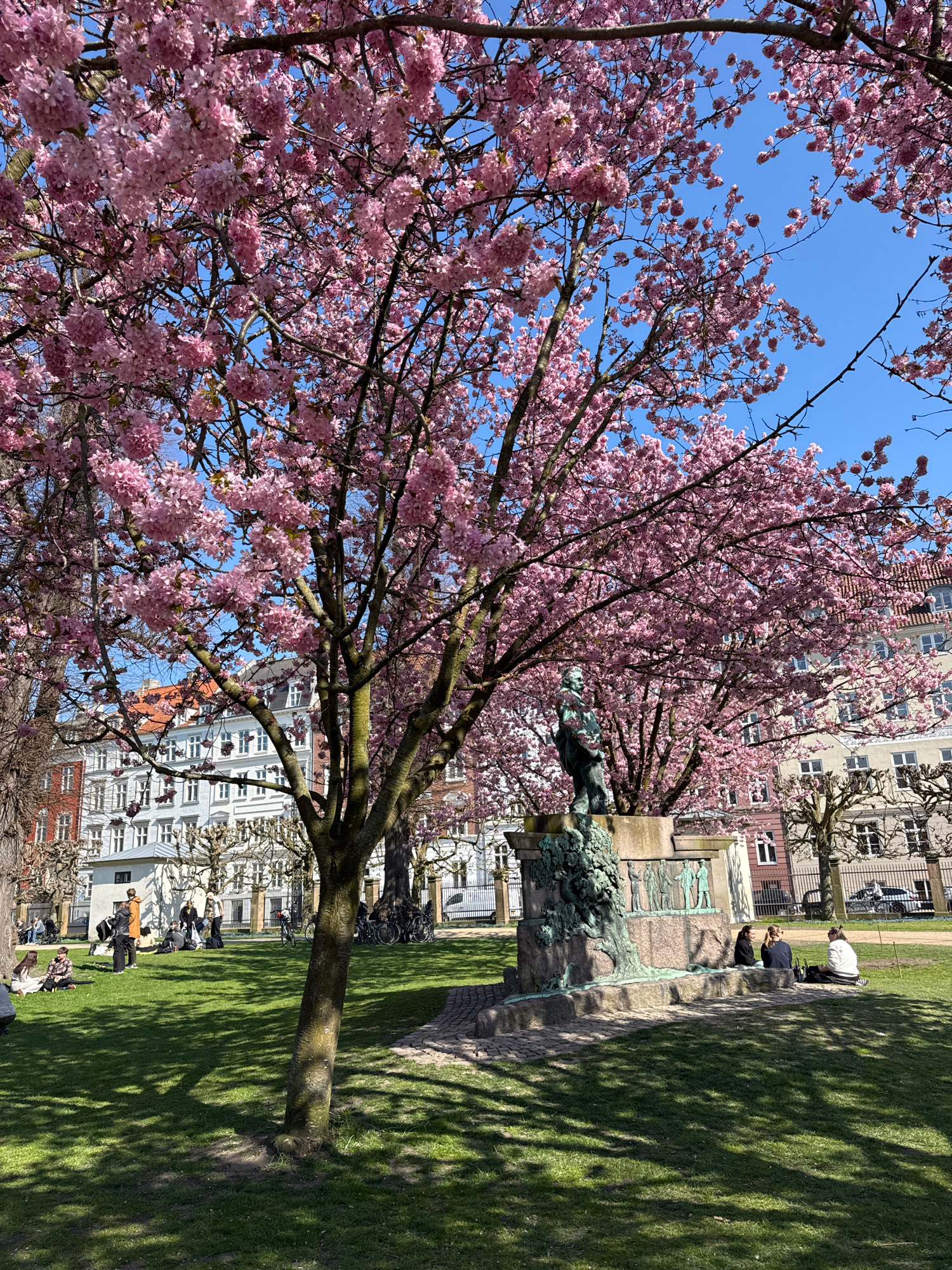 This media file captures a vibrant park scene on a sunny spring day in what is identified as Copenhagen, Denmark. The foreground and midground are dominated by a large, blossoming cherry tree with abu…read more