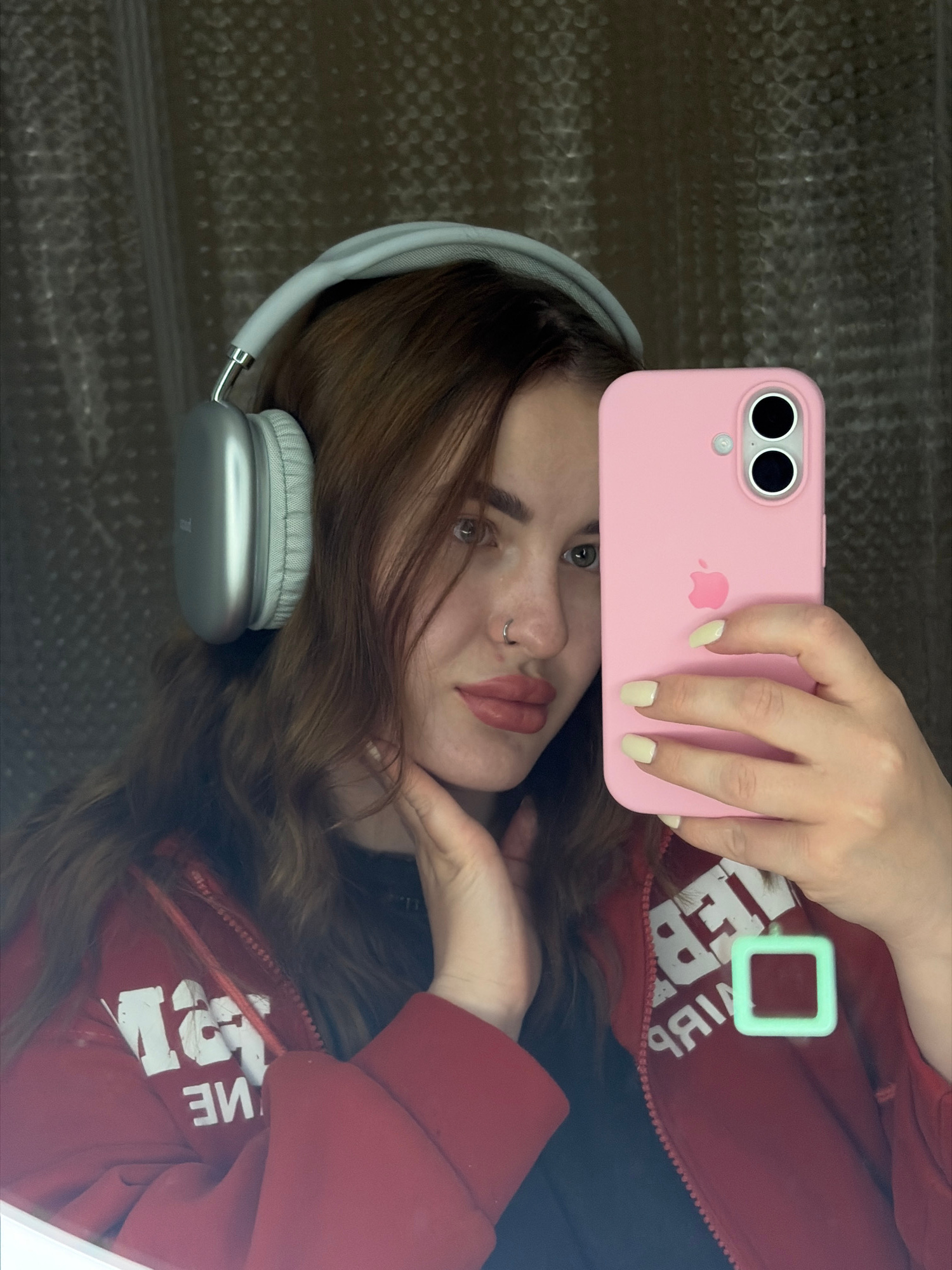 A young person with medium-length auburn hair is holding a pink iPhone in front of their face, ostensibly taking a selfie. The phone case is solid pink, featuring dual camera lenses and the Apple logo…read more