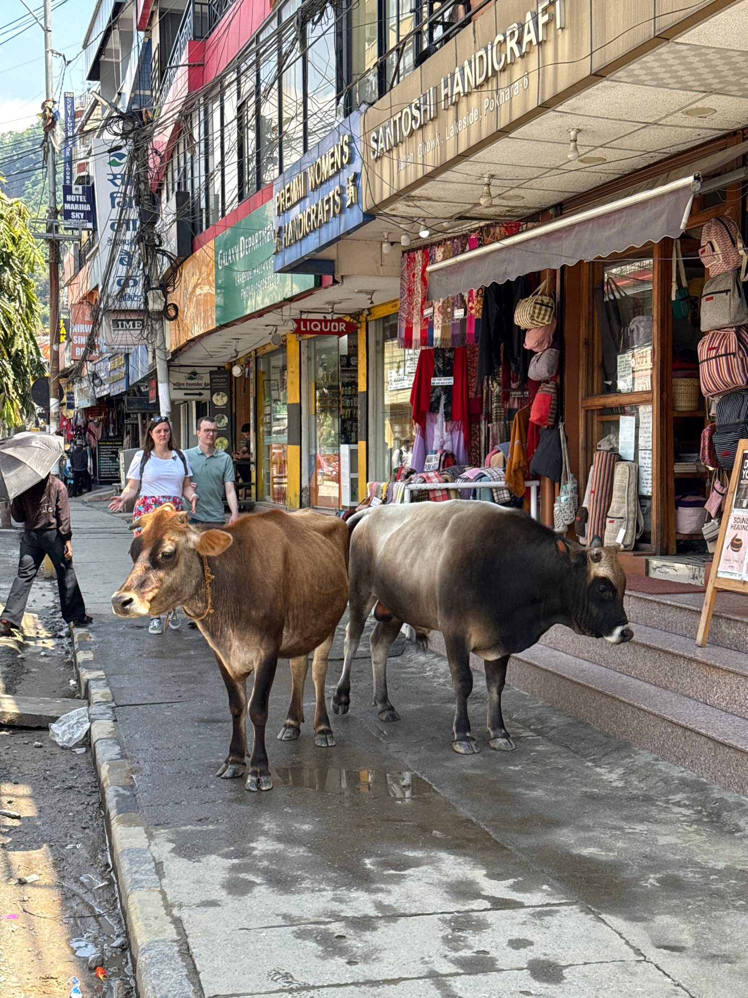 Here is a description of the image: The image shows a street scene in the city of Pokhara, Nepal. Two cows, one dark and one brown, are standing on the sidewalk in front of shops. The dark cow is clo…read more