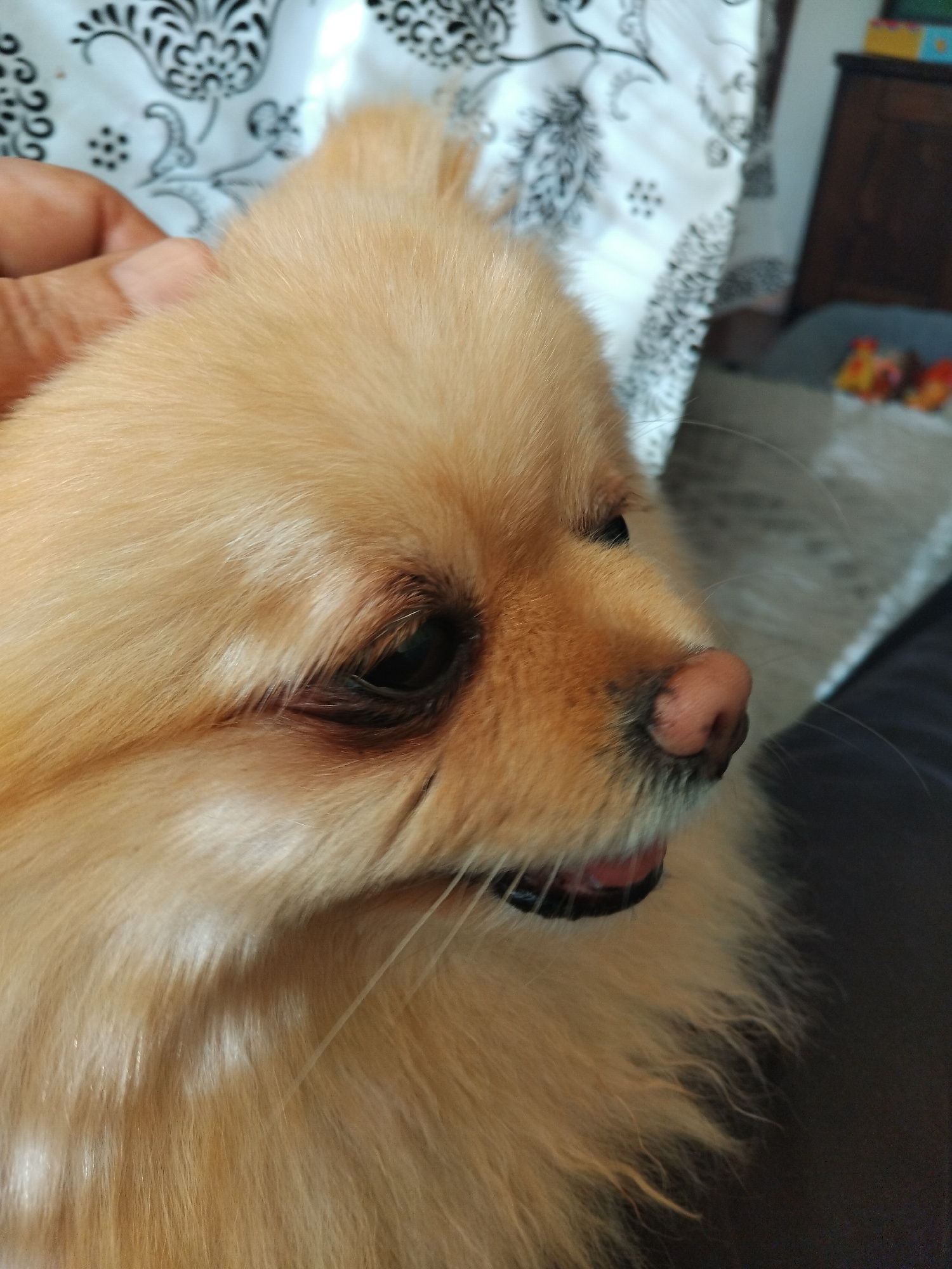 A close-up, high-angle shot depicts a Pomeranian dog resting on a patterned surface. The dog's head is turned slightly to the right, showcasing its eye, pink nose, and partially visible tongue. The fu…read more