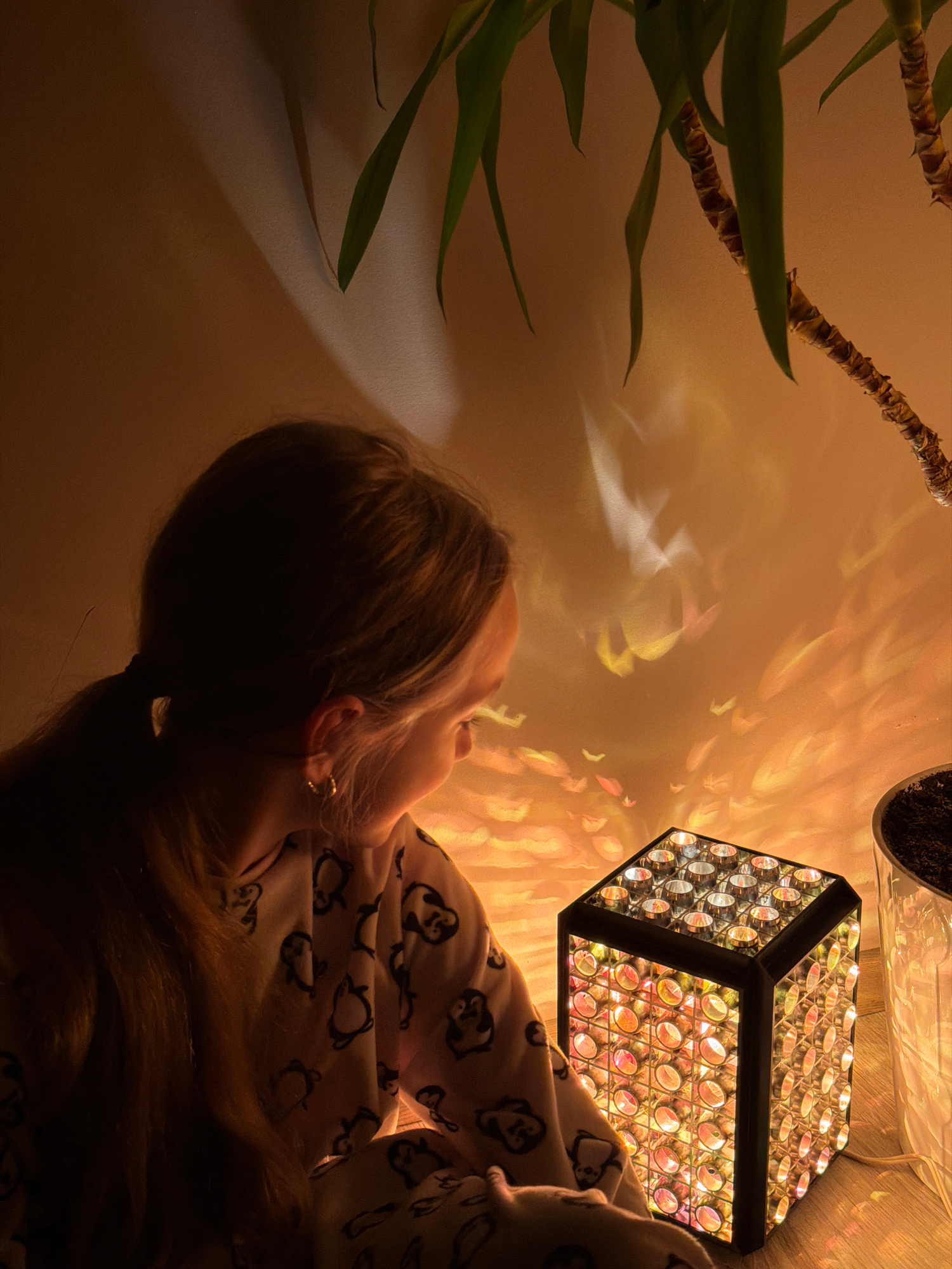 A photograph taken in Dreiliņi, Latvia, shows a young woman laying on her side in a dimly lit room. The light source appears to be a geometric lamp with multiple transparent facets casting patterns on the wall. The woman has light brown hair tied in a low ponytail and wears small hoop earrings. She is dressed in a light-colored garment with a penguin motif. To the left of the woman, a plant with long green leaves extends toward the top of the frame. Another potted plant is positioned near the lamp. The overall atmosphere is warm, with the lighting creating a sense of intimacy. | Open Wire
