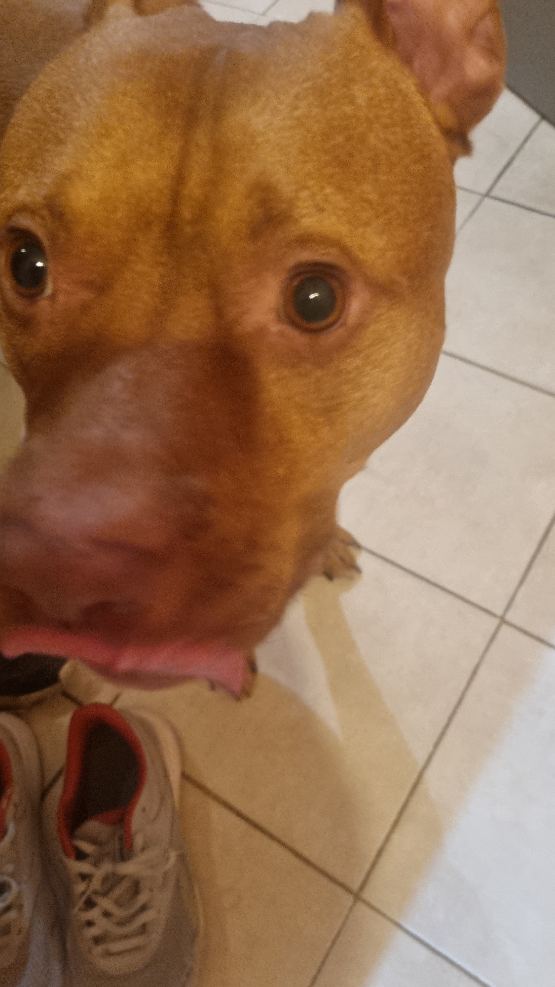 A tan-colored dog with large eyes is positioned in the foreground, looking upwards towards the camera. The dog's nose is large and pinkish. In the background, the floor is tiled with light-colored, sq…read more