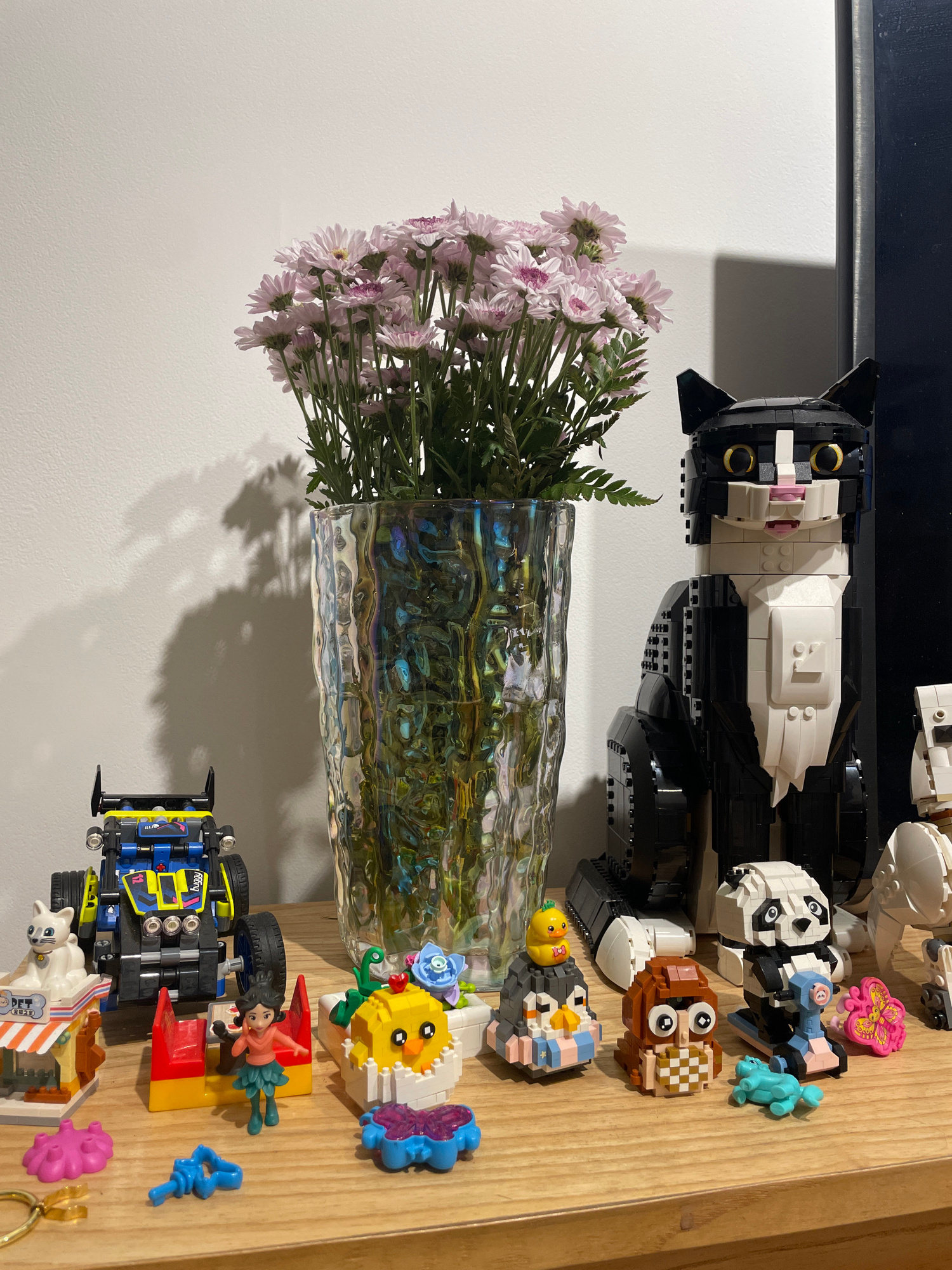 The image shows a still life arrangement on a wooden surface. From top to bottom: a Lego cat, followed by a Lego panda, a Lego owl, and other small Lego creations. Below the Lego creations is a glass…read more