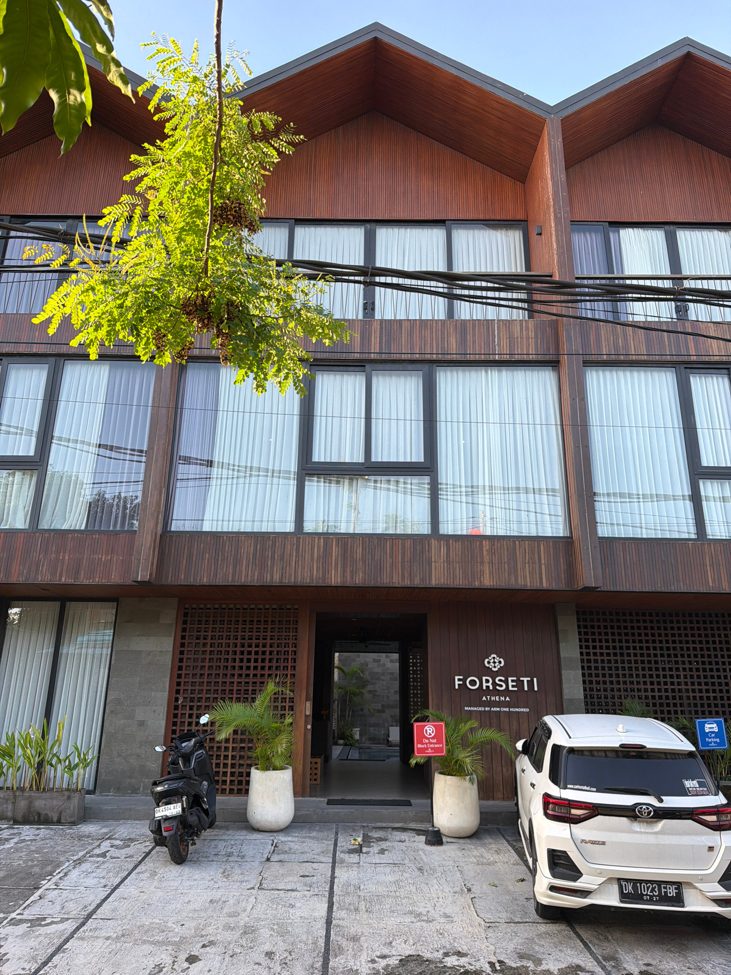 The image shows the exterior of Forseti Athena, a building located in Denpasar, Indonesia. The building has a modern design with a wood and glass facade. There are large windows with white blinds. A w…read more