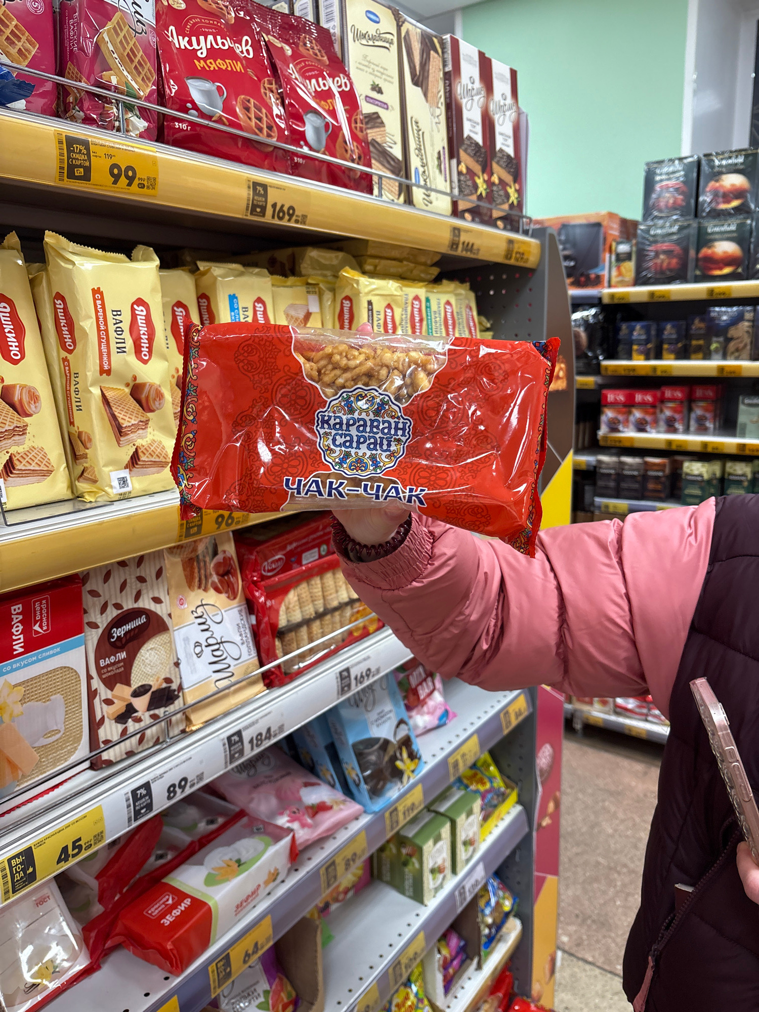 A person in a pink winter jacket holds a red package of "Karavan Sarai Chak-Chak" snack food in a store in Chaikovsky, Russia. The image focuses on the snack held up in front of shelves stocked with v…read more