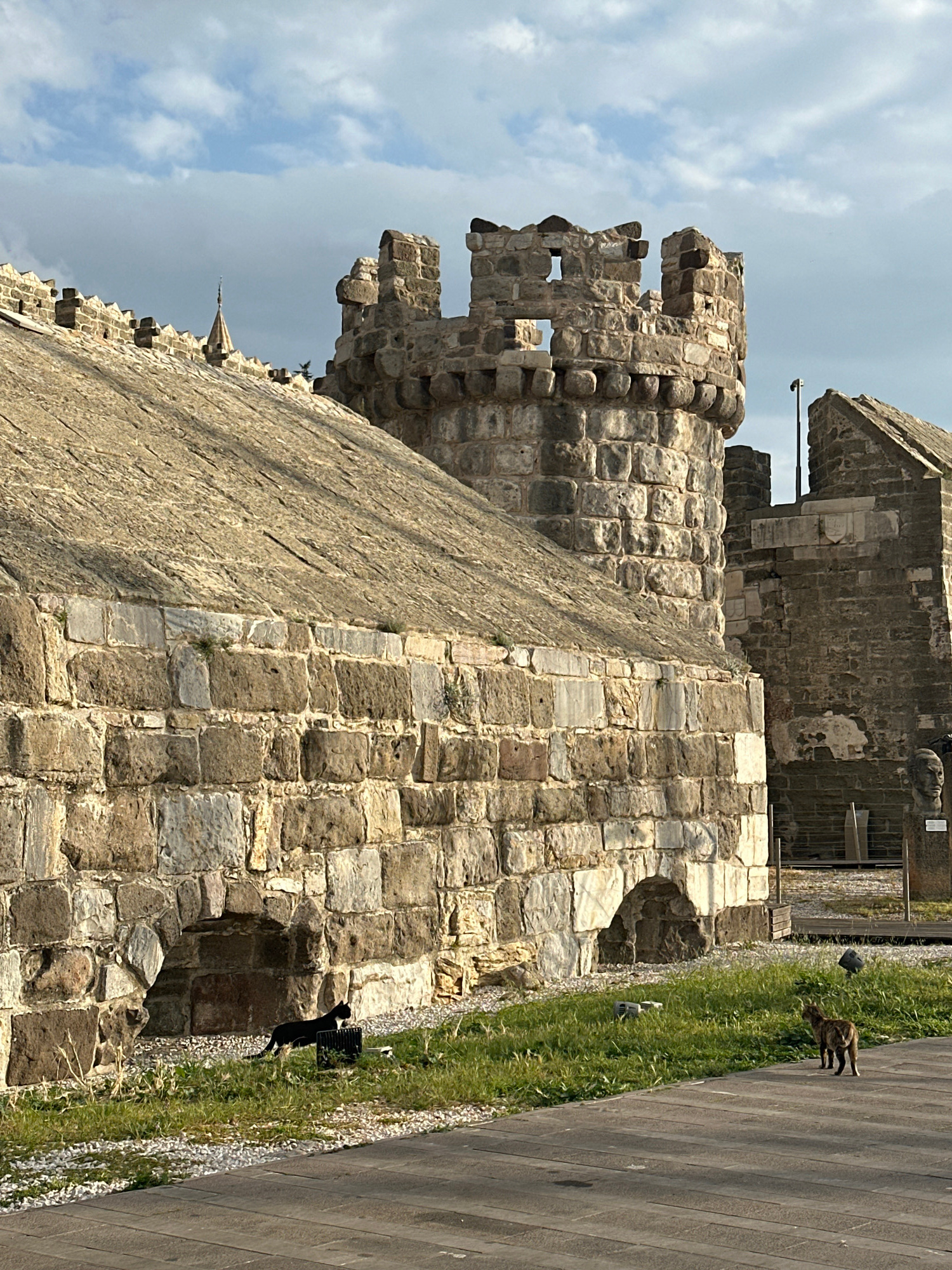 The image displays a section of Bodrum Castle (Castle of St. Peter) in Bodrum, Turkey, under a partly cloudy sky. The central subject is a robust stone fortification, comprising a wide, sloped rampart…read more