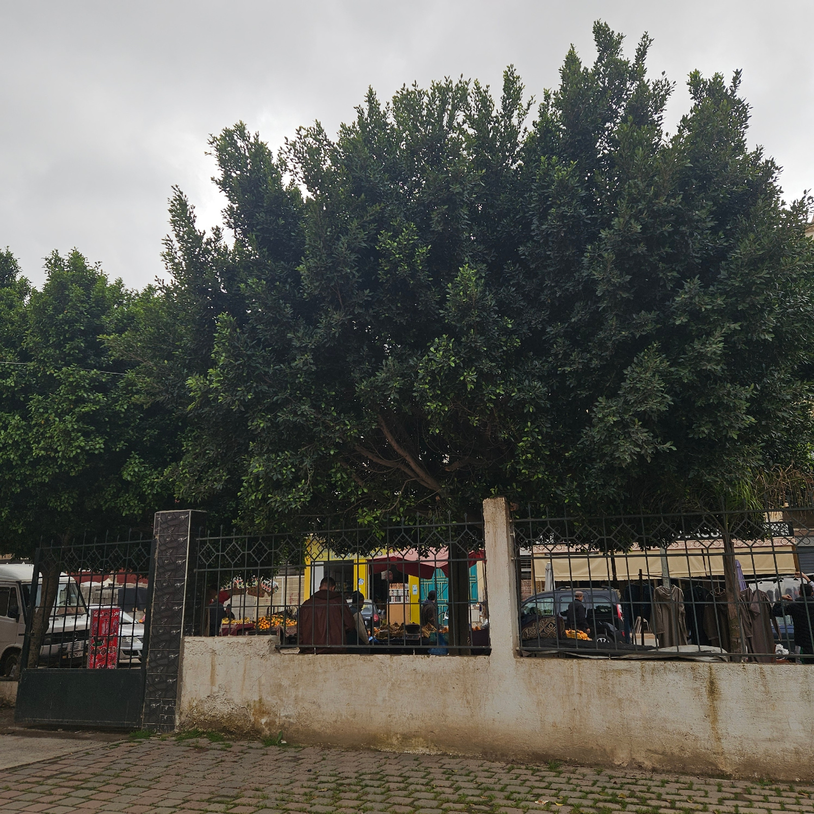 The image shows a street scene in Fez, Morocco. A large, green, leafy tree occupies much of the left side of the frame, obscuring a clear view behind it. To the right of the tree is a section of a walβ¦read more