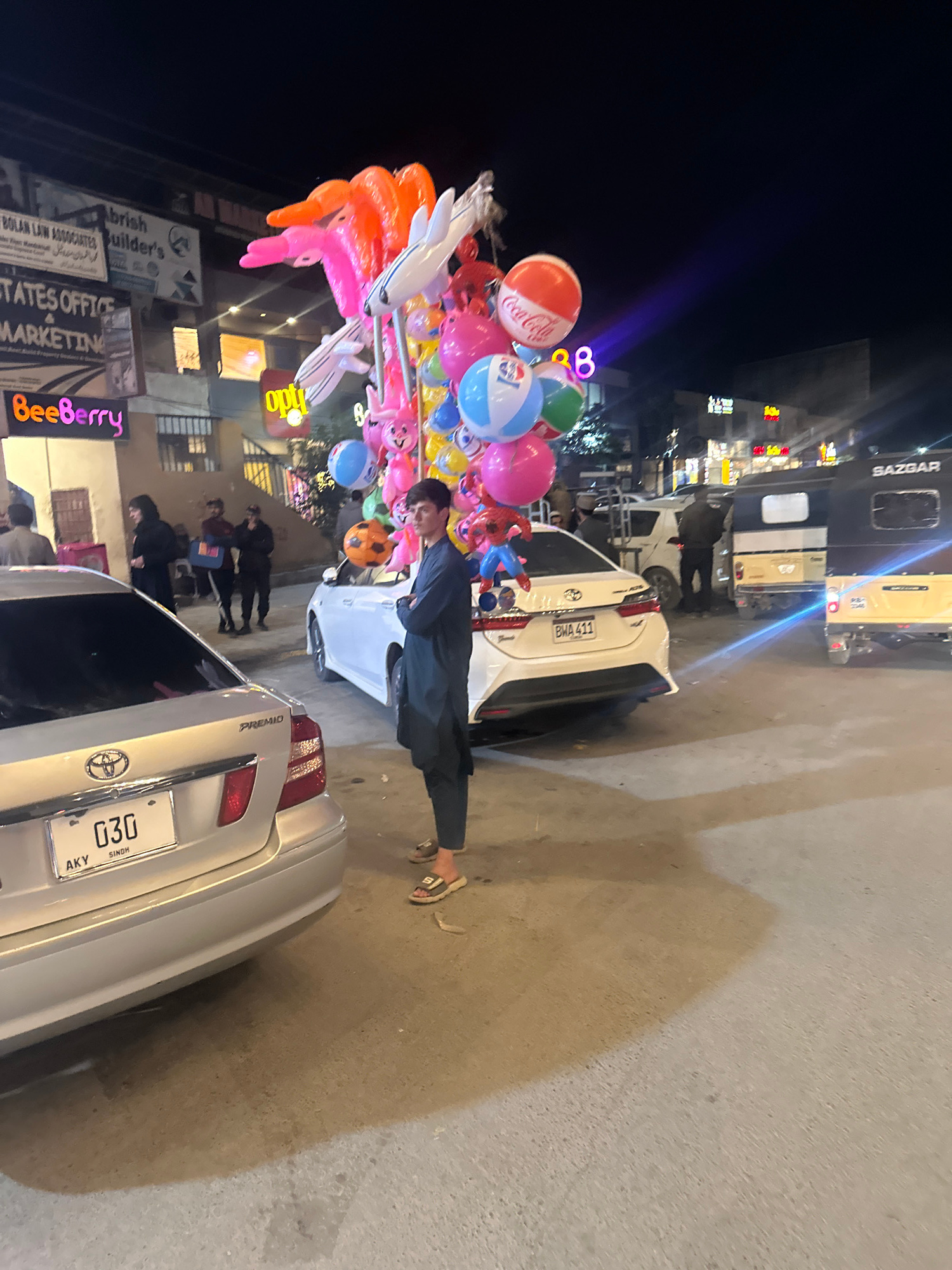 The image depicts a nighttime street scene in Quetta City Tehsil, Pakistan. Dominating the frame is a balloon vendor holding a large cluster of balloons, including recognizable Coca-Cola and Pepsi-bra…read more