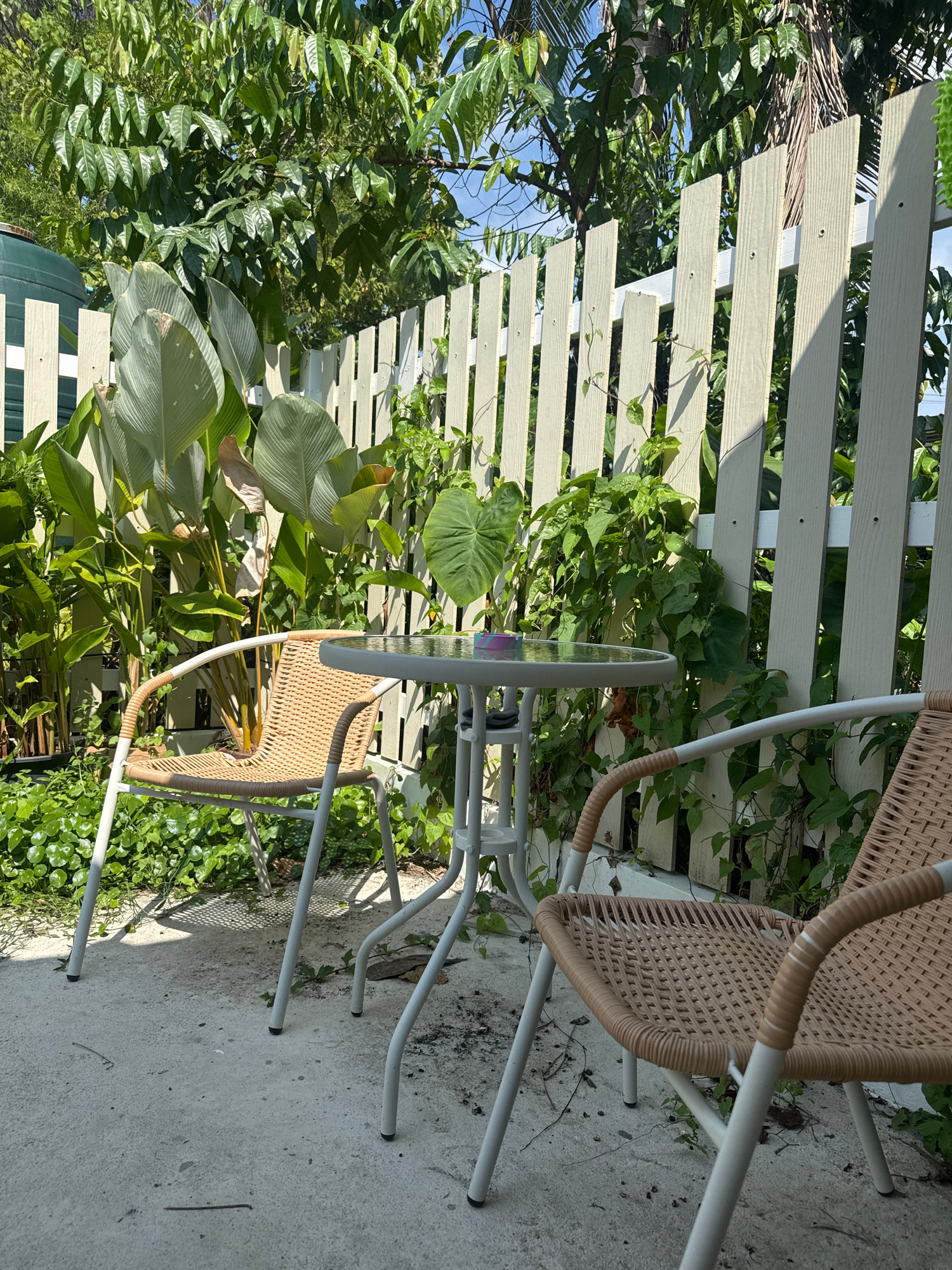 The image depicts an outdoor seating area in Choeng Thale, Thailand. Two wicker chairs with white metal frames flank a small glass-topped table, also with a white metal frame. The setting is a concret…read more