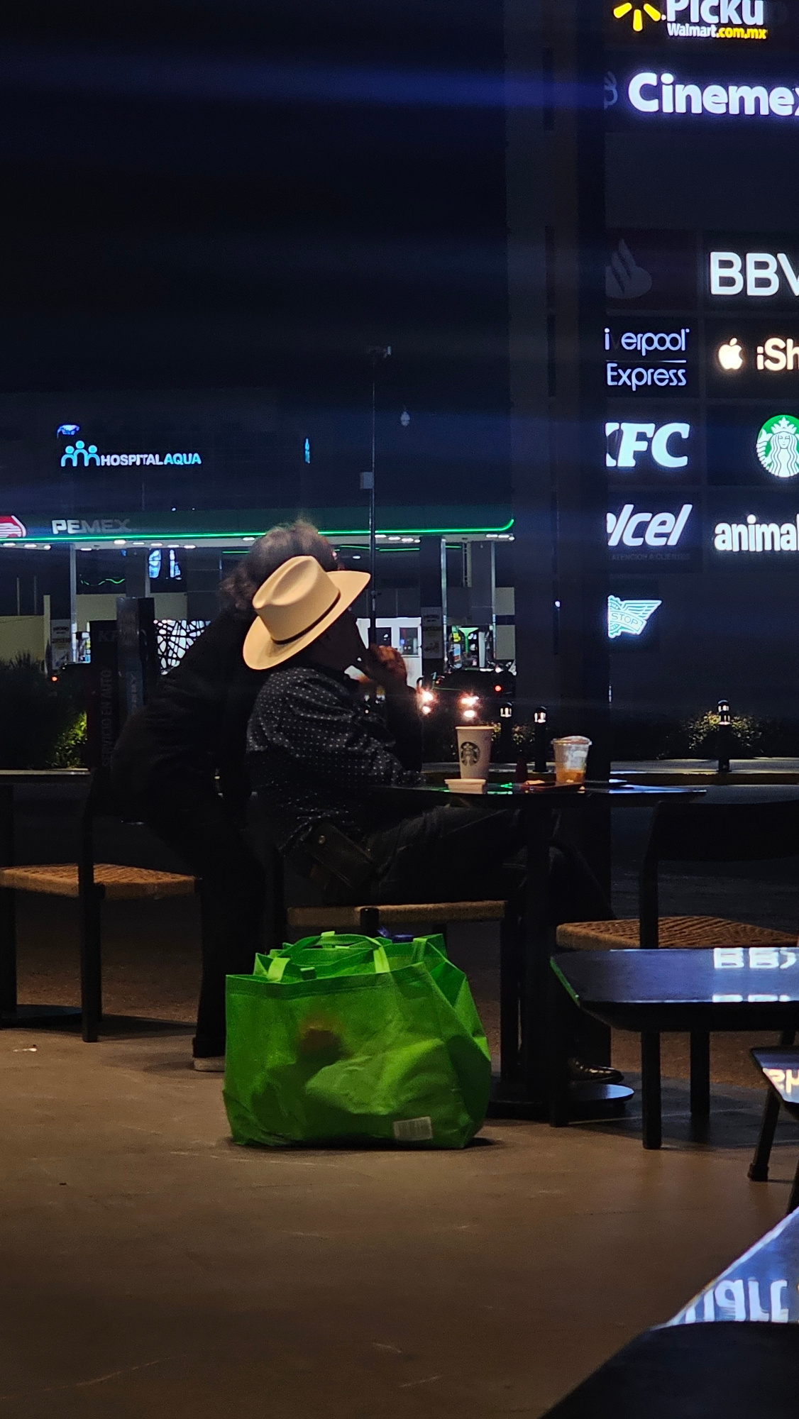 Here is a detailed description of the image: **General Description** The photo appears to be taken at night in an urban outdoor setting. The dominant features include illuminated store signs and a pā¦read more