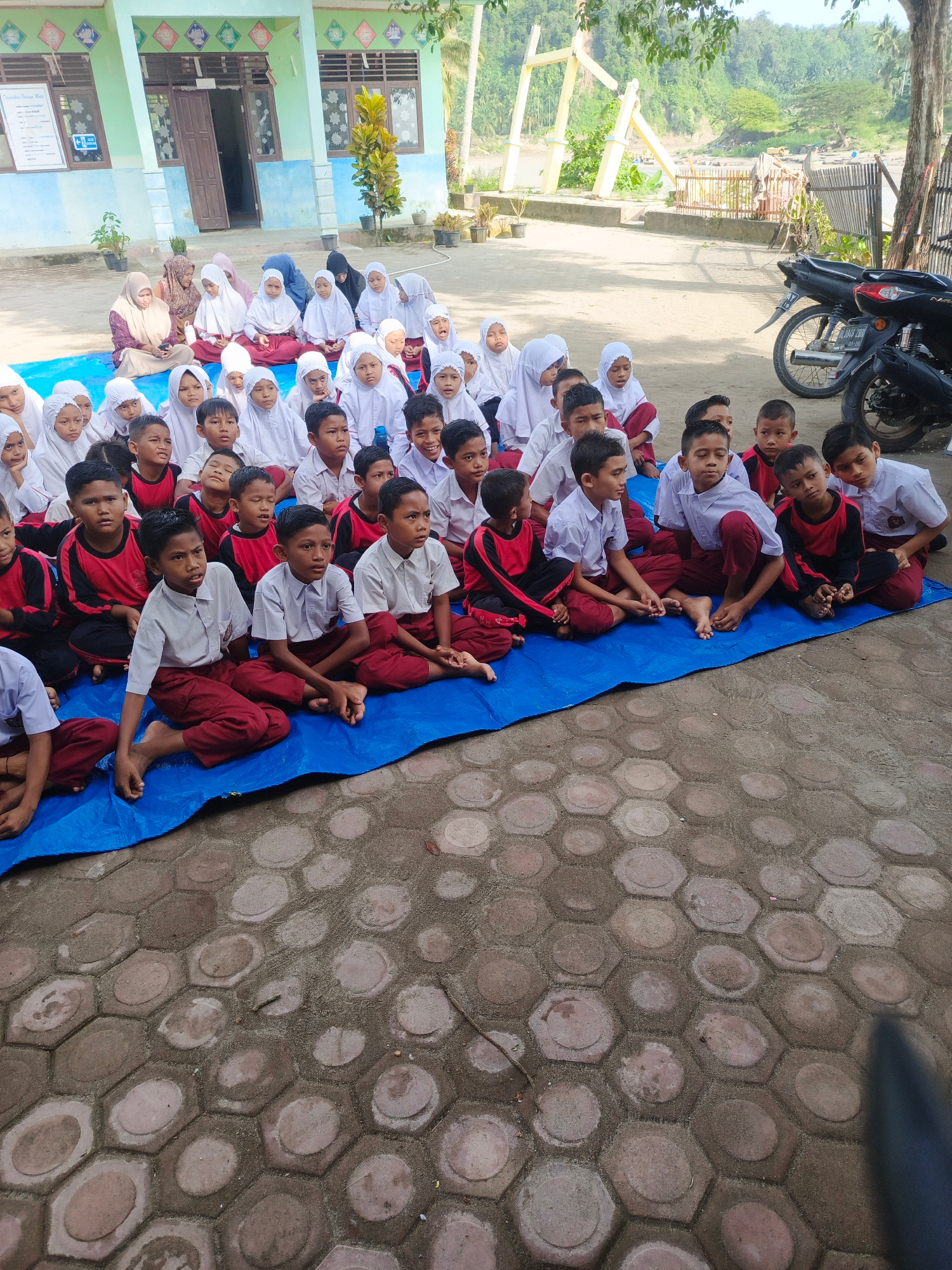 This outdoor photograph captures a group of children, likely elementary school students, and a few adults gathered on a bright, sunny day in what appears to be Simpangjaya, Indonesia. The children are…read more