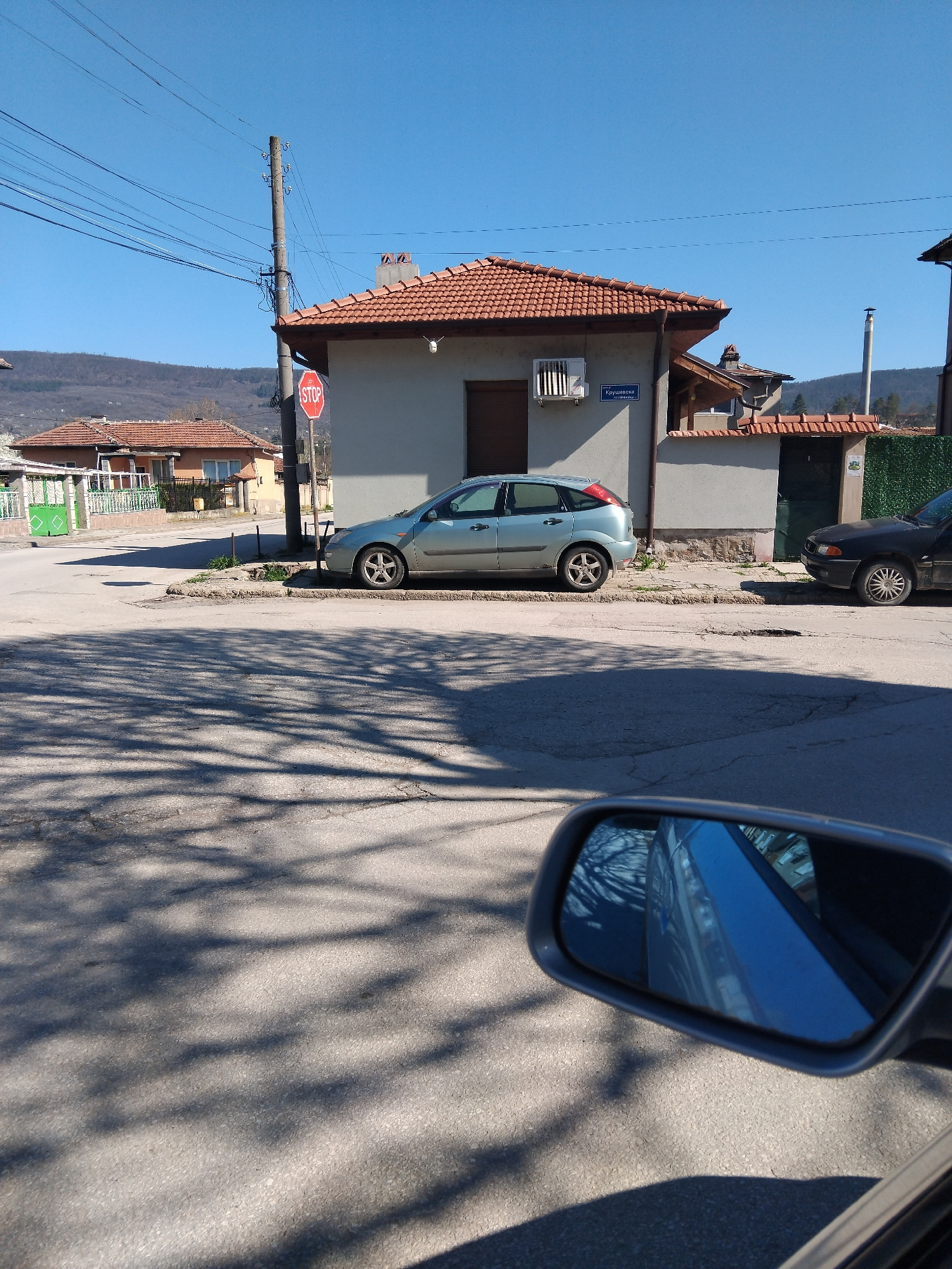 The image depicts a street scene in Sevlievo, Bulgaria. A light blue Ford Focus is parked on the side of the street next to a building with a red-tiled roof. A street sign with the name "Коущеева" is…read more