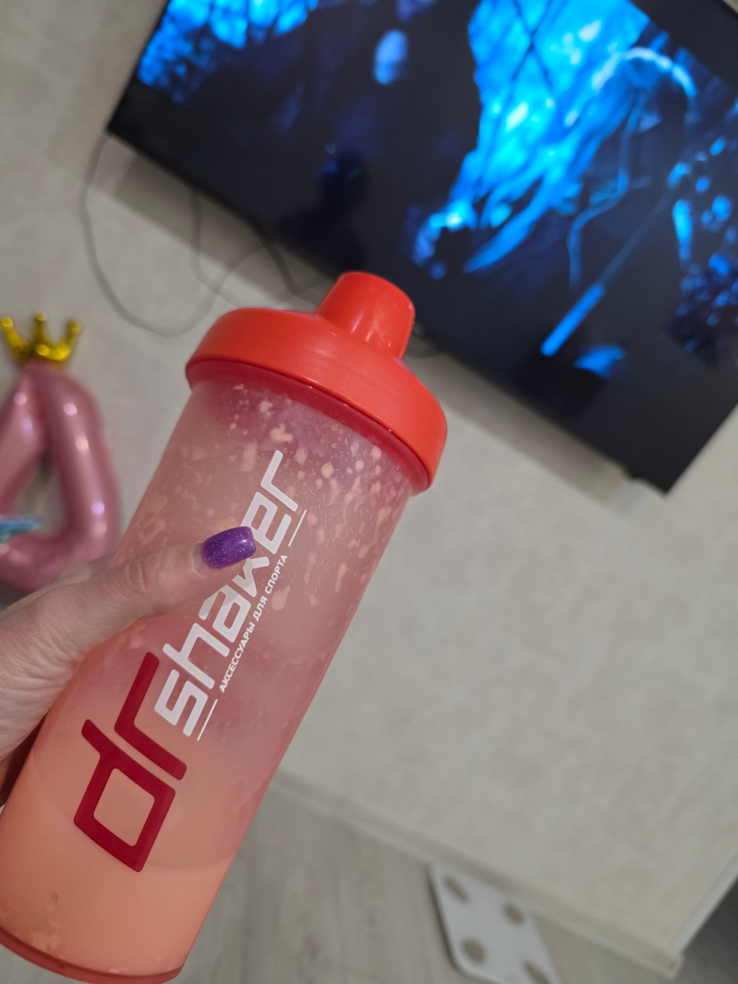 The image presents a close-up indoor scene, dominated by a hand holding a shaker bottle. The bottle is translucent pinkish-orange with a vibrant red lid, containing a frothy, light-colored liquid with…read more