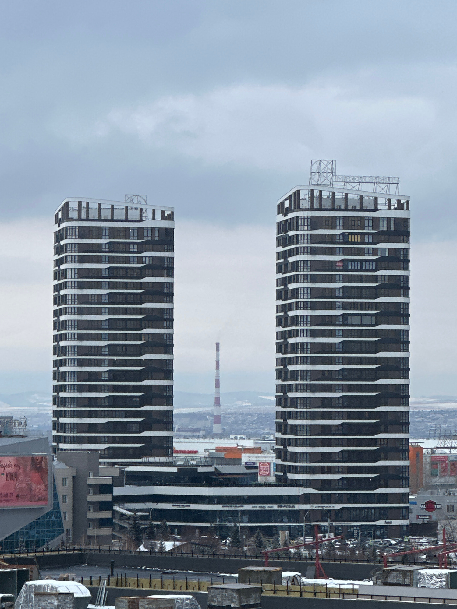 The image captures a panoramic view of an urban landscape in Krasnoyarsk, Russia, under an overcast sky. Two prominent, modern high-rise buildings, identical in design, stand in the mid-ground. Each b…read more