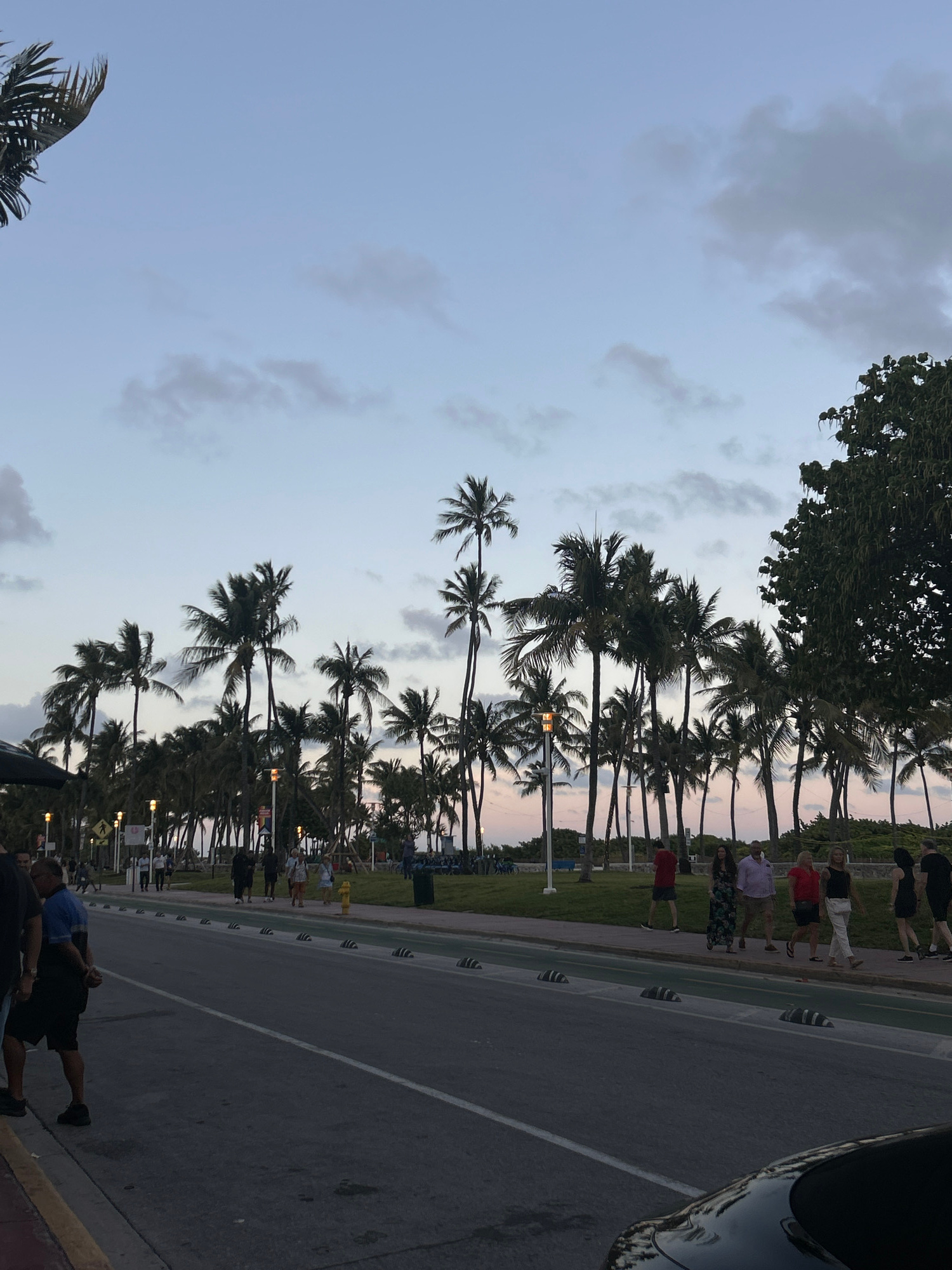 This vertical image, when rotated clockwise for proper viewing, captures an outdoor scene at dusk or twilight in Miami Beach. The upper portion of the frame features a soft light blue sky with scatter…read more