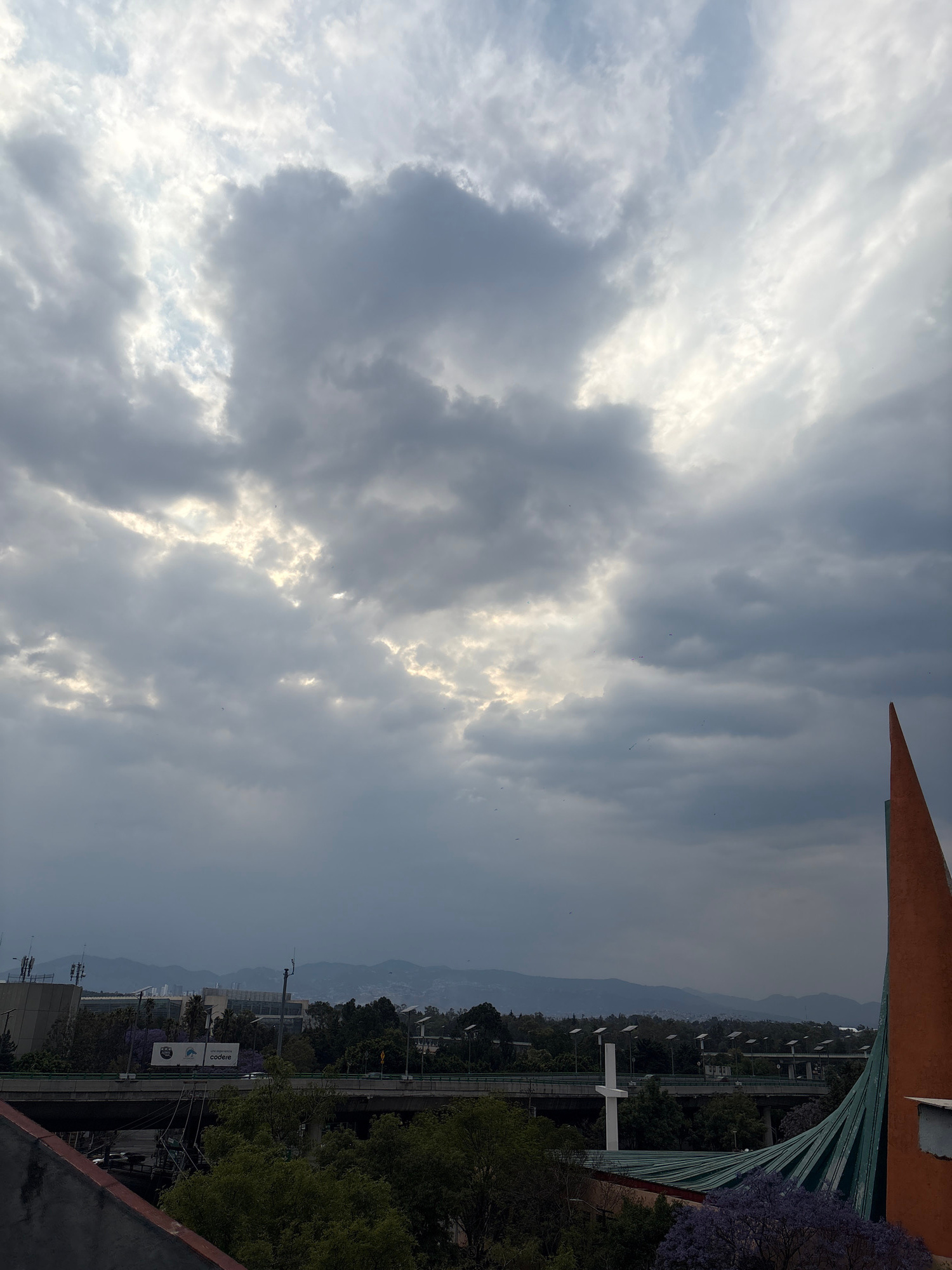The image depicts a cloudy sky above a cityscape in Mexico City, Mexico. A highway with cars is visible, along with buildings and trees. A tall white cross stands near the highway. Parts of a structur…read more