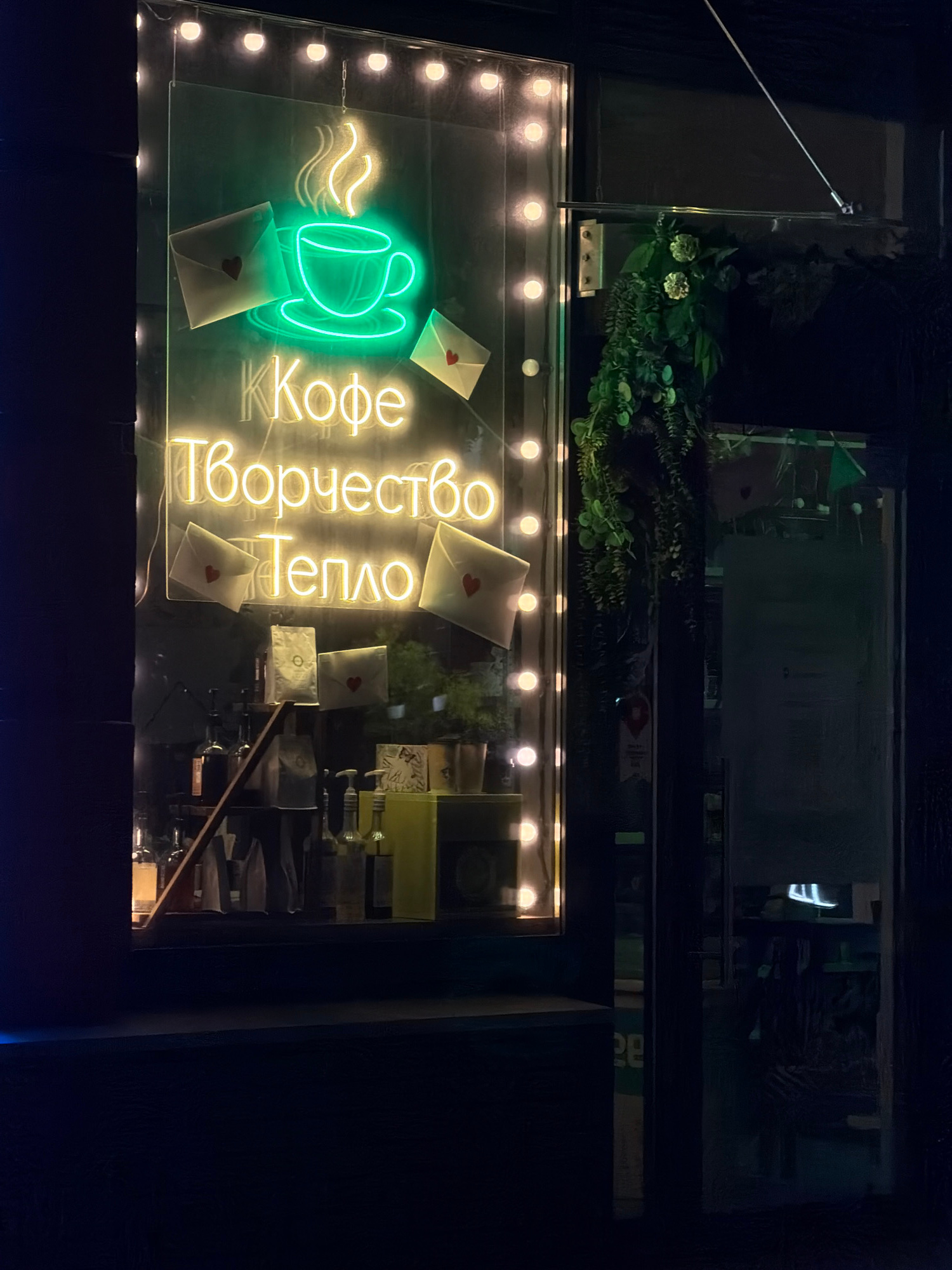 The image depicts an illuminated sign in Murino, Russia, likely an advertisement for a café. The sign, featuring a green neon coffee cup with steam and yellow neon lettering, is mounted in a window. T…read more