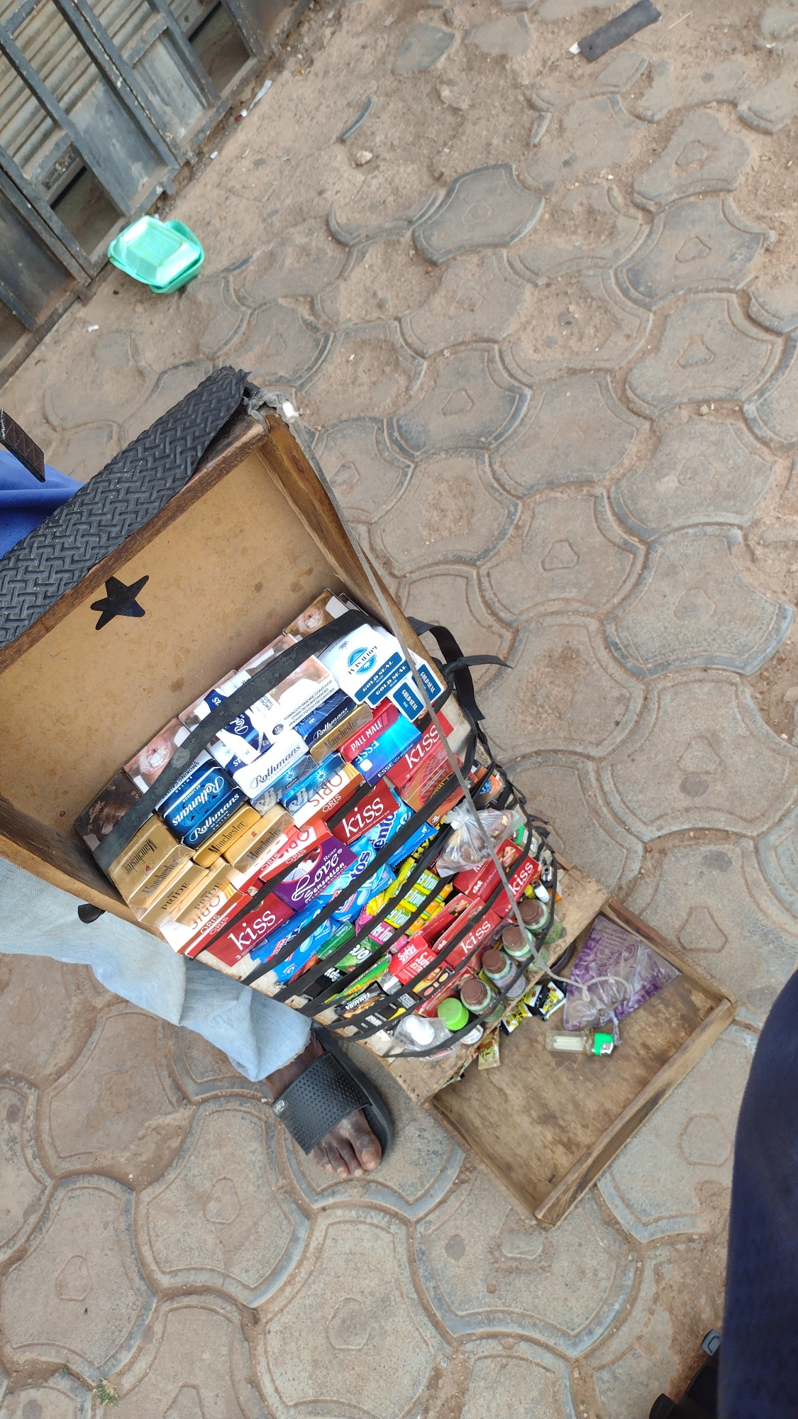 This image depicts a street vendor in Jos, Nigeria, displaying cigarettes and other small items in a wooden case. The vendor, wearing a sandal, is standing on a paved sidewalk. The wooden case is divi…read more