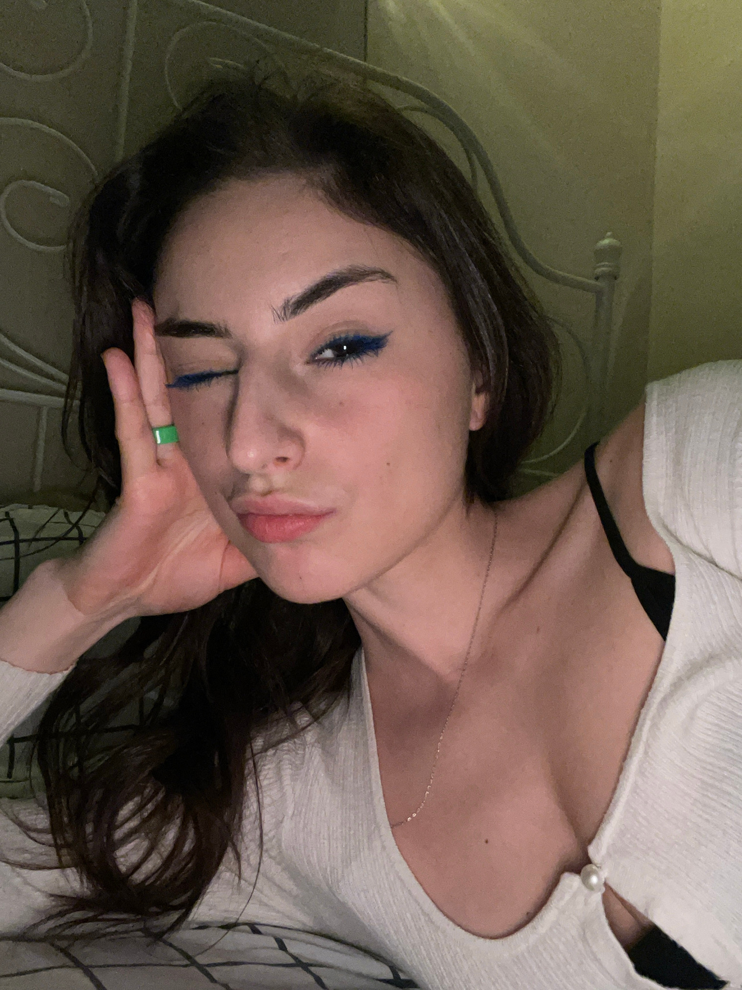 A woman with dark hair and blue eyeliner is lying down, her head resting on her hand. She is wearing a white top with a pearl detail. A thin gold necklace is visible around her neck. A green ring is o…read more