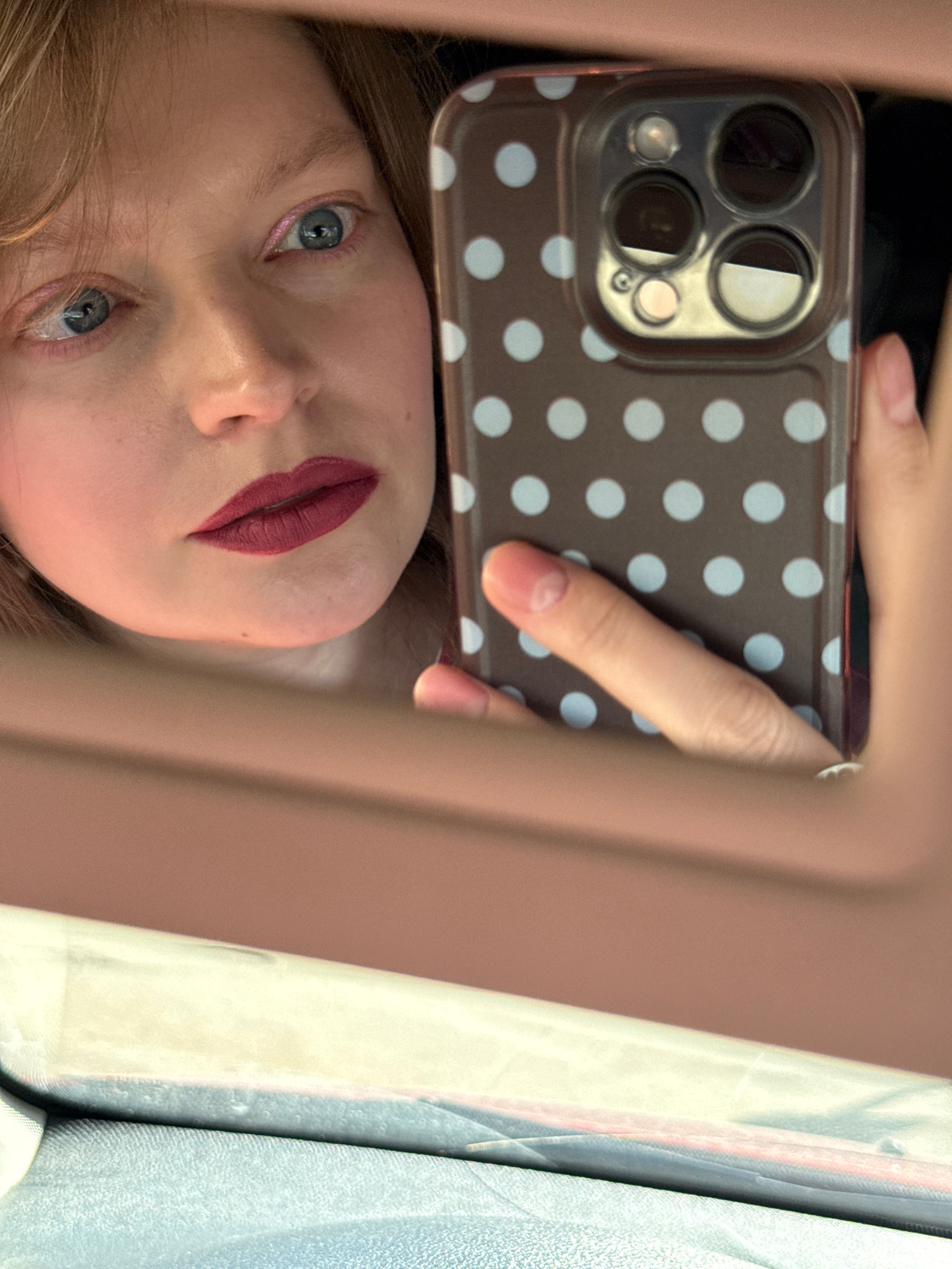 A woman is taking a selfie in a mirror. She is holding a smartphone with a brown polka dot case up to the mirror. The camera lenses are visible on the phone. The woman has blue eyes, fair skin, and is…read more