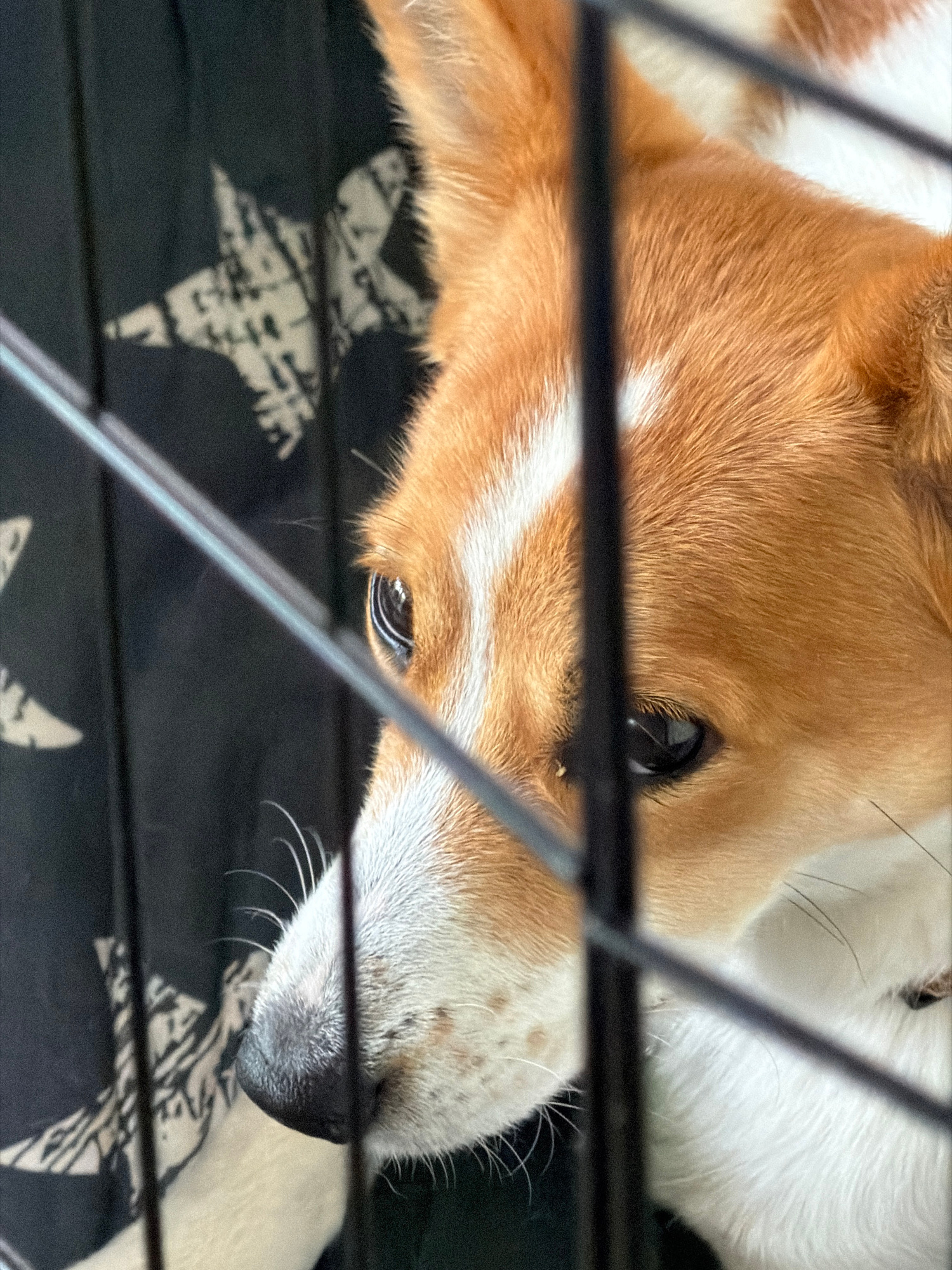 A close-up shot depicts a dog's face through a metal cage. The dog's fur is primarily reddish-brown and white. Its black eyes and nose are visible. The dog rests on a black and white patterned fabric…read more