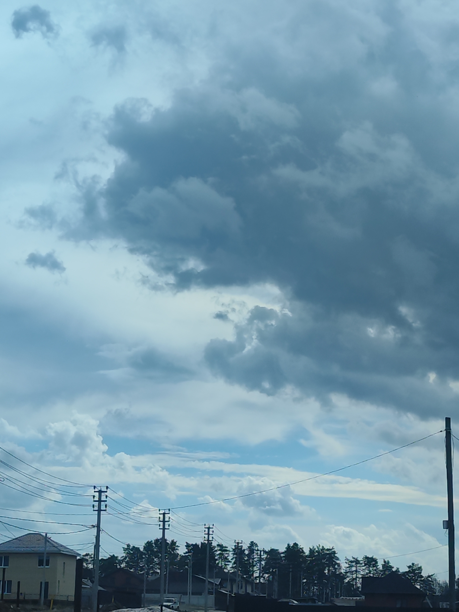 The image displays an outdoor scene dominated by a heavily clouded sky, suggestive of unsettled weather in a residential or semi-rural area of Chaikovsky, Russia. The sky occupies the majority of the…read more