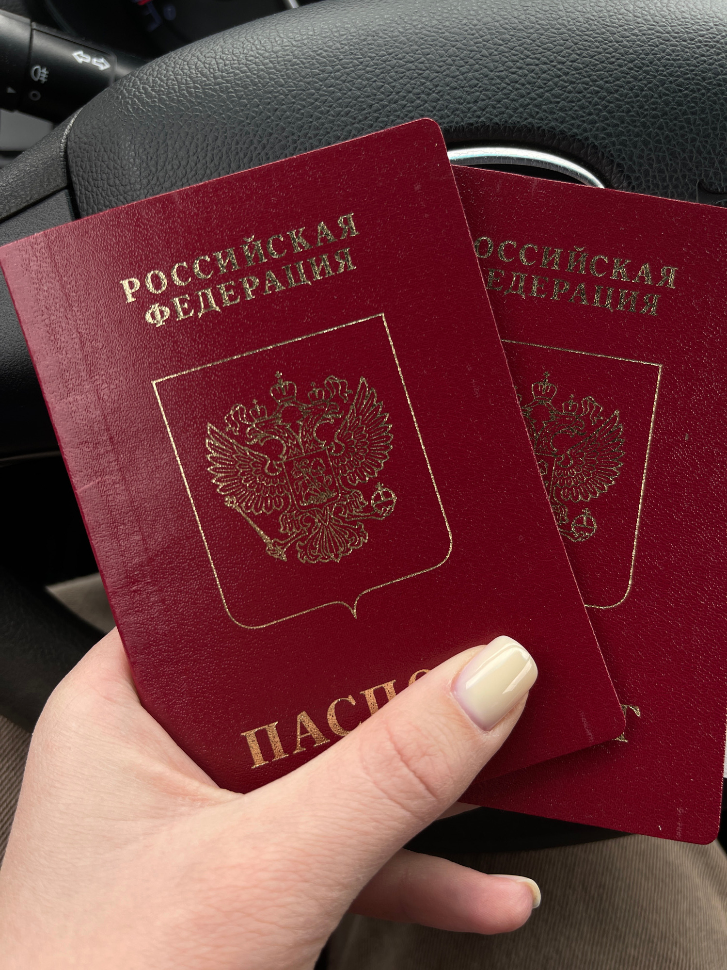 A close-up shot shows a fair-skinned hand with manicured nails holding two maroon passports, identified by the gold text as Russian Federation passports. The passports bear the emblem of Russia in gol…read more