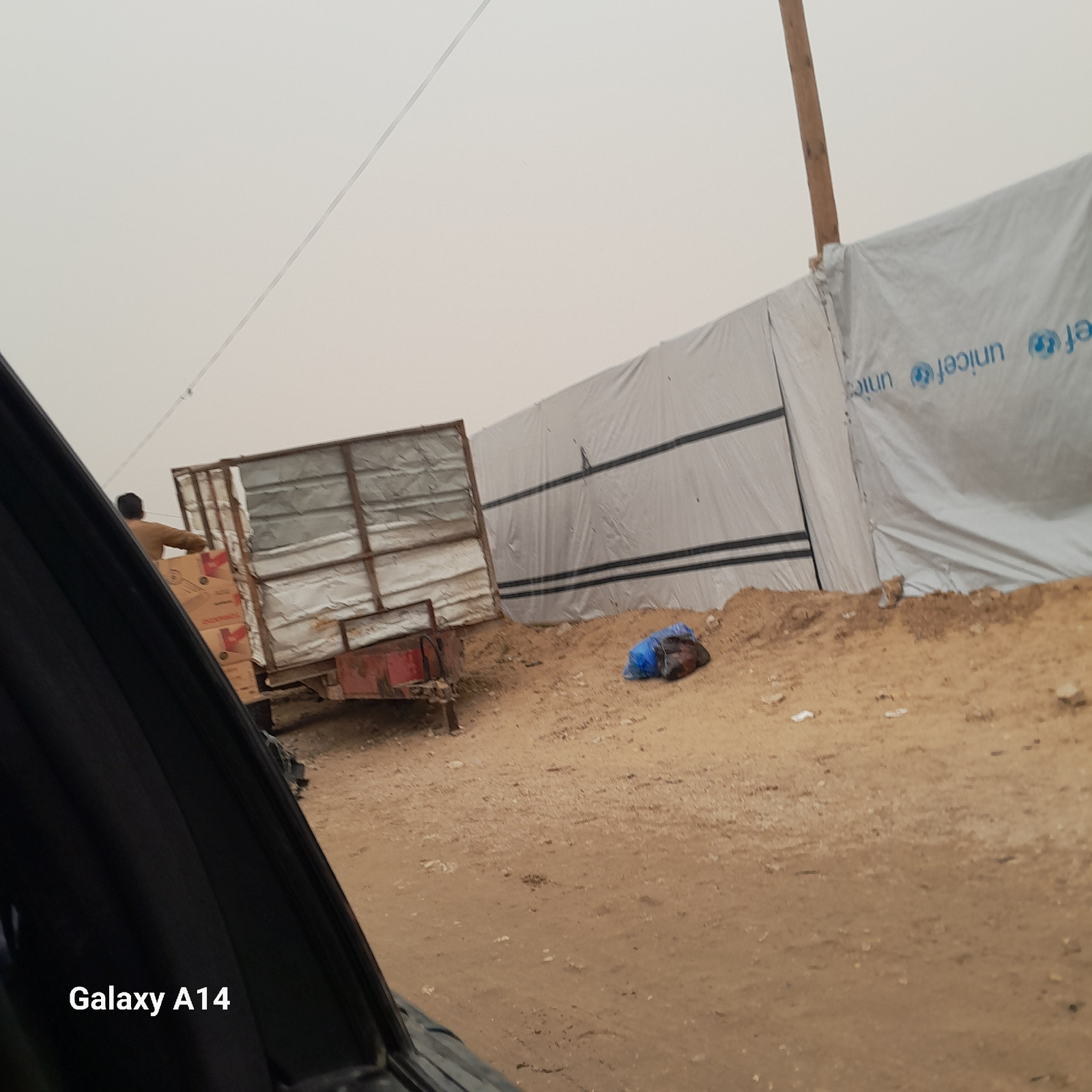 The image depicts a scene likely in Khan Yunis, Palestinian Territory, showing a structure with "Unicef" branding. Adjacent to it is a dirt ground with a blue object. Further, a trailer-like structure with metal framing and translucent paneling is visible, loaded with cardboard boxes. The scene is photographed from inside a vehicle. A person's hand appears near the trailer. The environment appears arid and dusty. | Open Wire