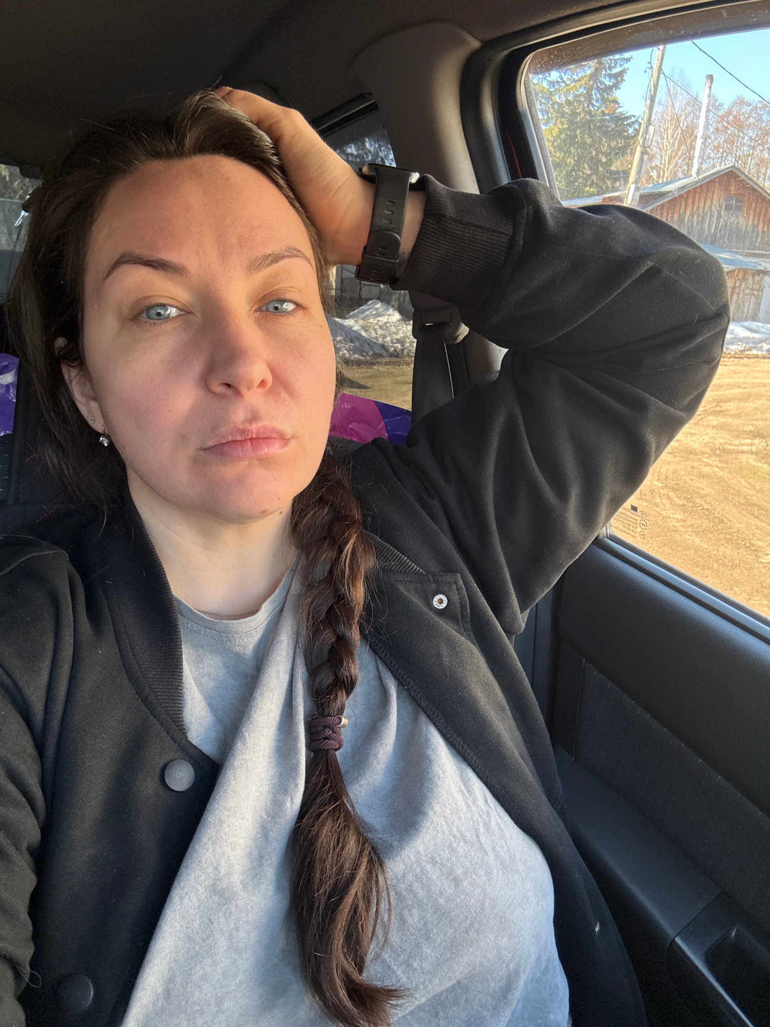 A portrait-style selfie taken inside a vehicle features a person, likely female, with medium-dark brown hair styled in a braid secured with a dark hair tie. She has prominent blue eyes and a neutral e…read more