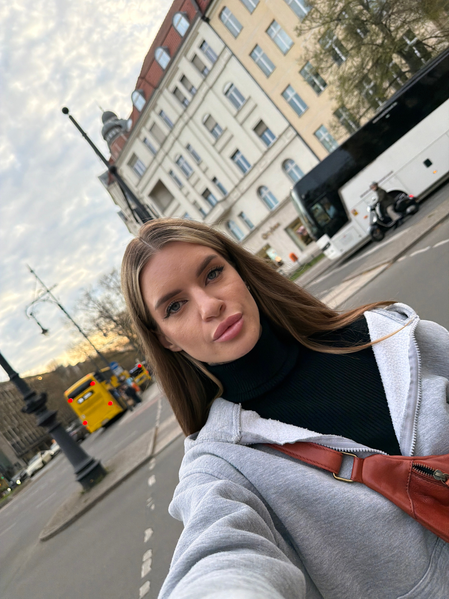 A medium-shot photograph depicts a young woman wearing a grey zippered hoodie, a black turtleneck, and a brown crossbody bag. She is looking directly at the camera with a neutral expression. The sett…read more