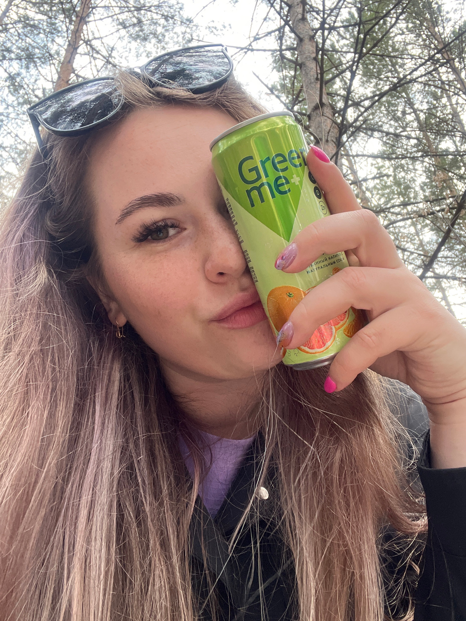 A young woman with long, light brown hair is holding a can of Green Me grapefruit-flavored beverage in front of her face. She has sunglasses perched on her forehead and is wearing a light purple shirt…read more