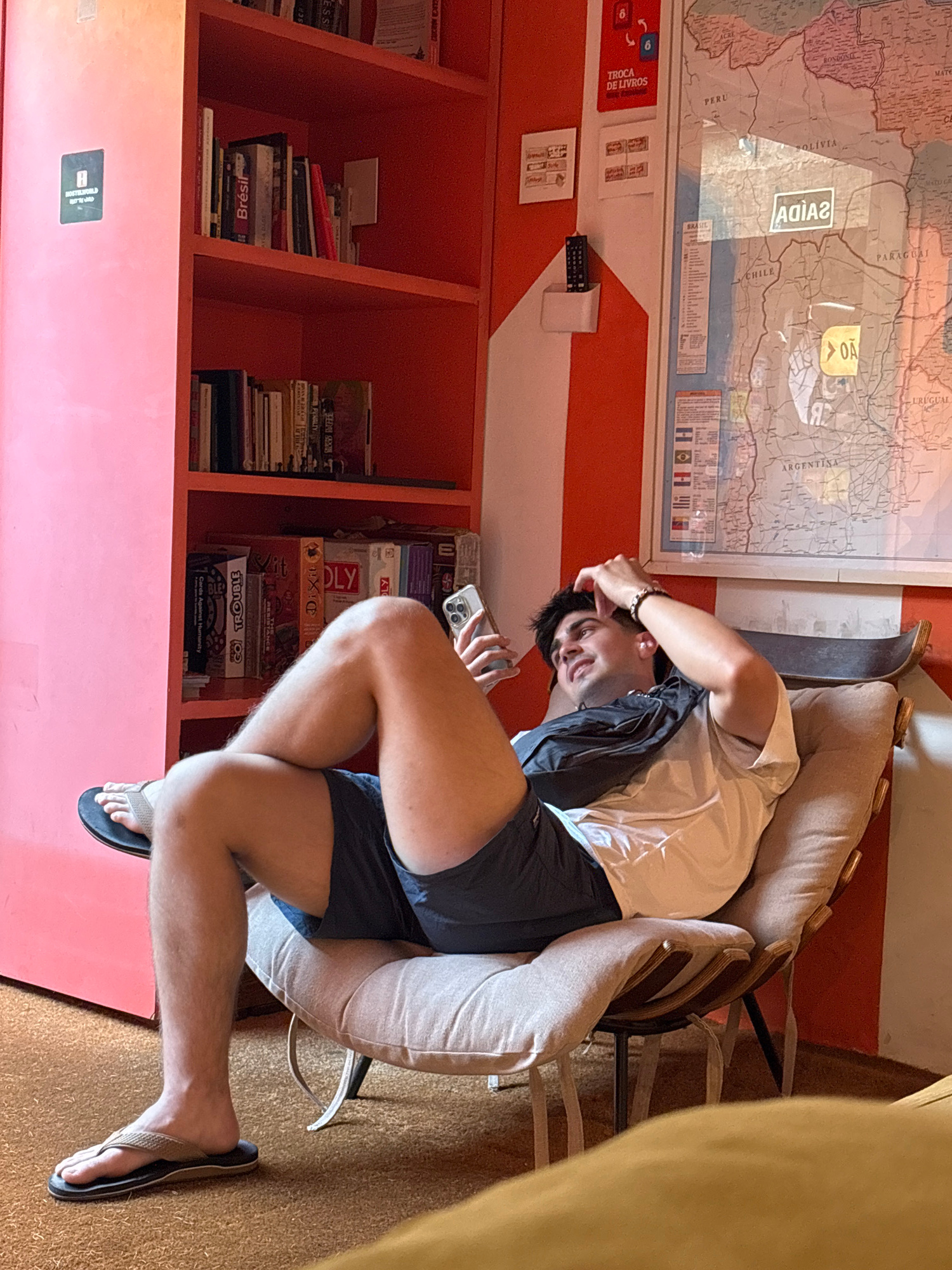 The image captures an indoor scene, likely a common area or lounge within a hostel, identified by a "TROCA DE LIVROS" (Book Exchange) sign and a prominent map. A young man, appearing relaxed, is the c…read more