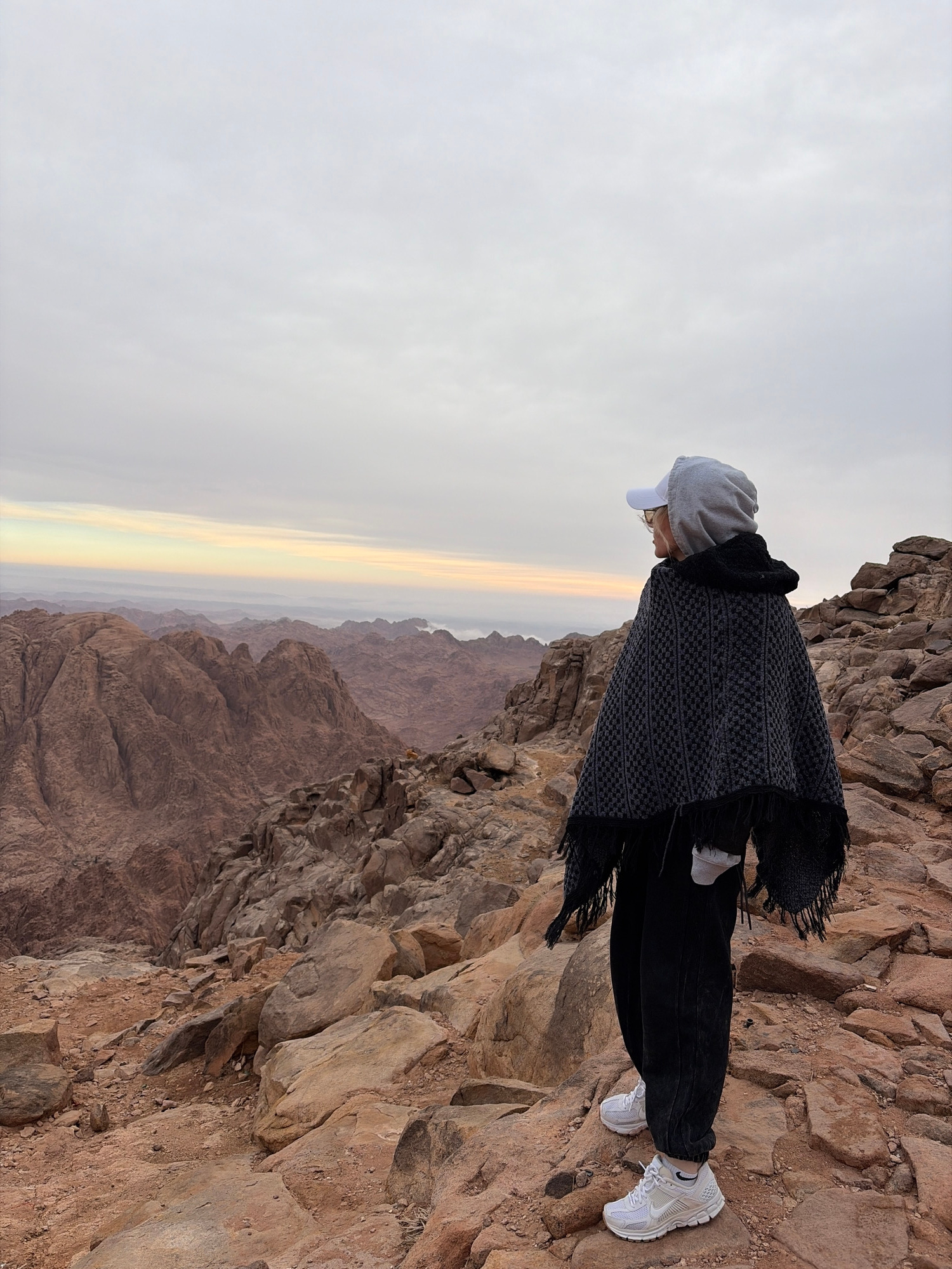 A person is standing on a rocky, mountainous terrain with a vast canyon or valley stretching in the background. The person is facing the canyon, wearing a light-colored baseball cap, a grey hooded swe…read more