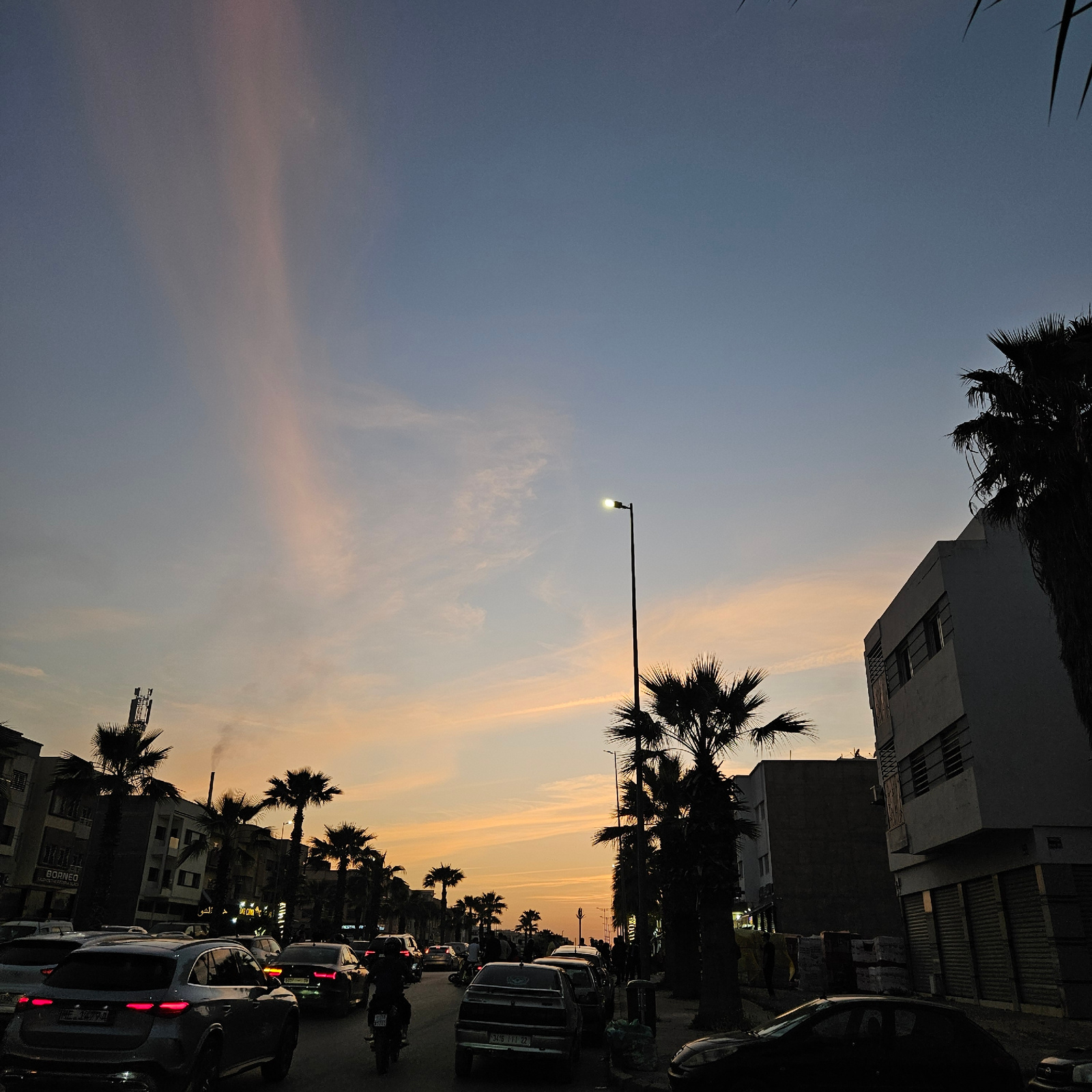 The image depicts an urban street scene at dusk or sunset, characterized by a vibrant sky transitioning from deep blue on the left to warm orange and pink hues on the right. The sun has either just se…read more