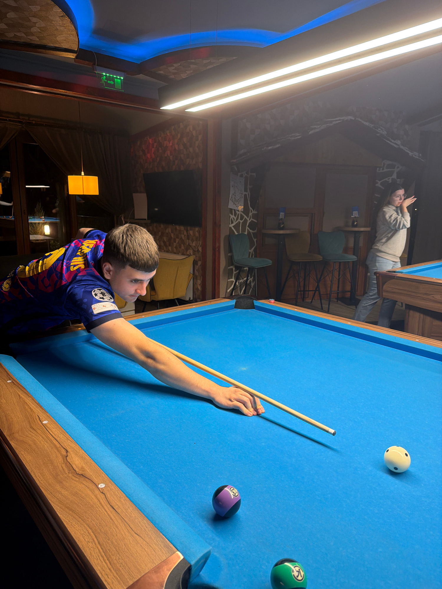 A young man in a Barcelona soccer jersey is playing pool in a room with a wooden-themed interior. He's aiming the cue stick towards a white cue ball, with a purple 9-ball and a green 3-ball nearby on…read more