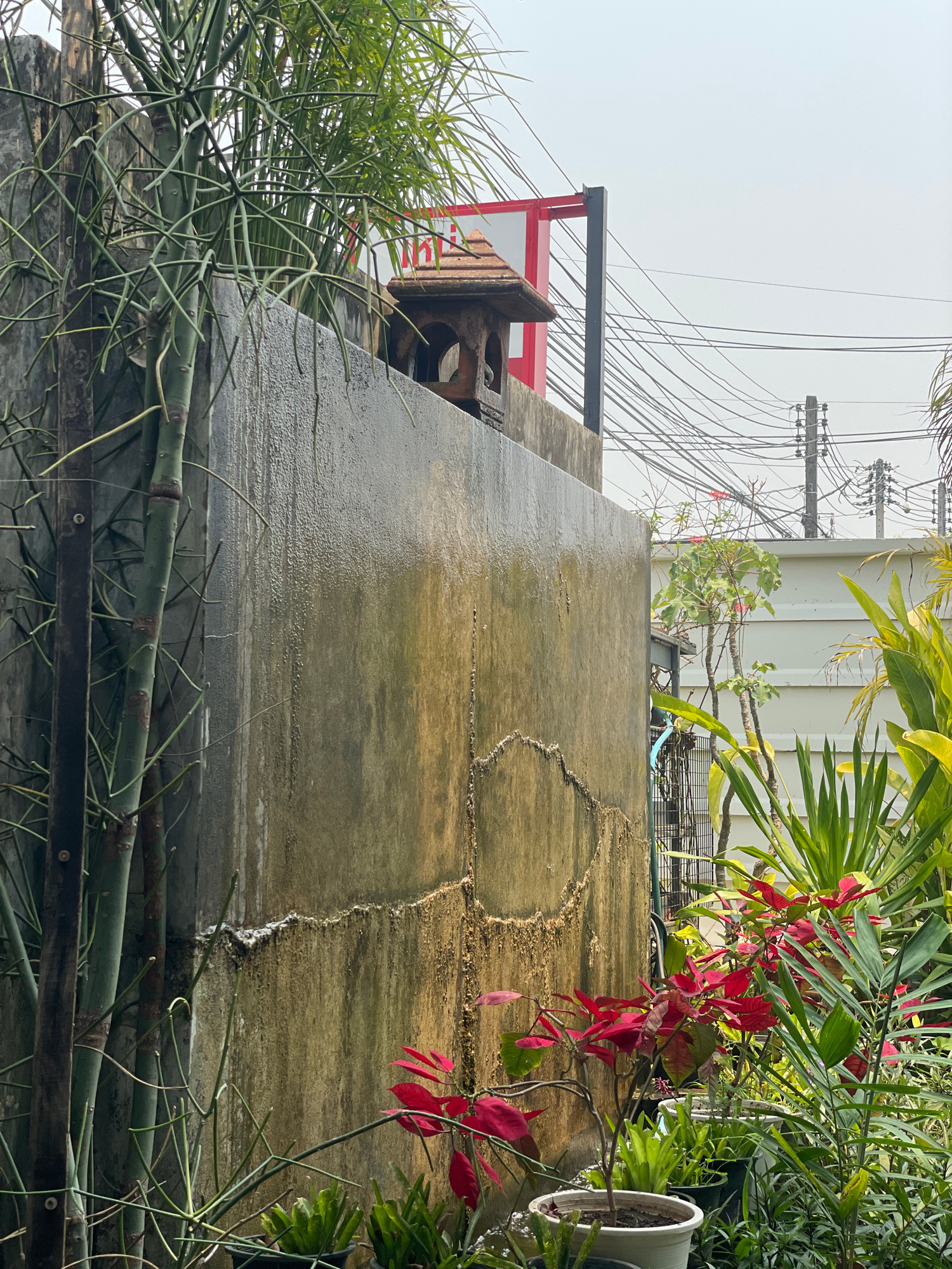 This media file depicts an outdoor scene in Chiang Mai City Municipality, Thailand, featuring a blend of urban infrastructure and lush tropical vegetation. In the midground, a prominent, flat concret…read more
