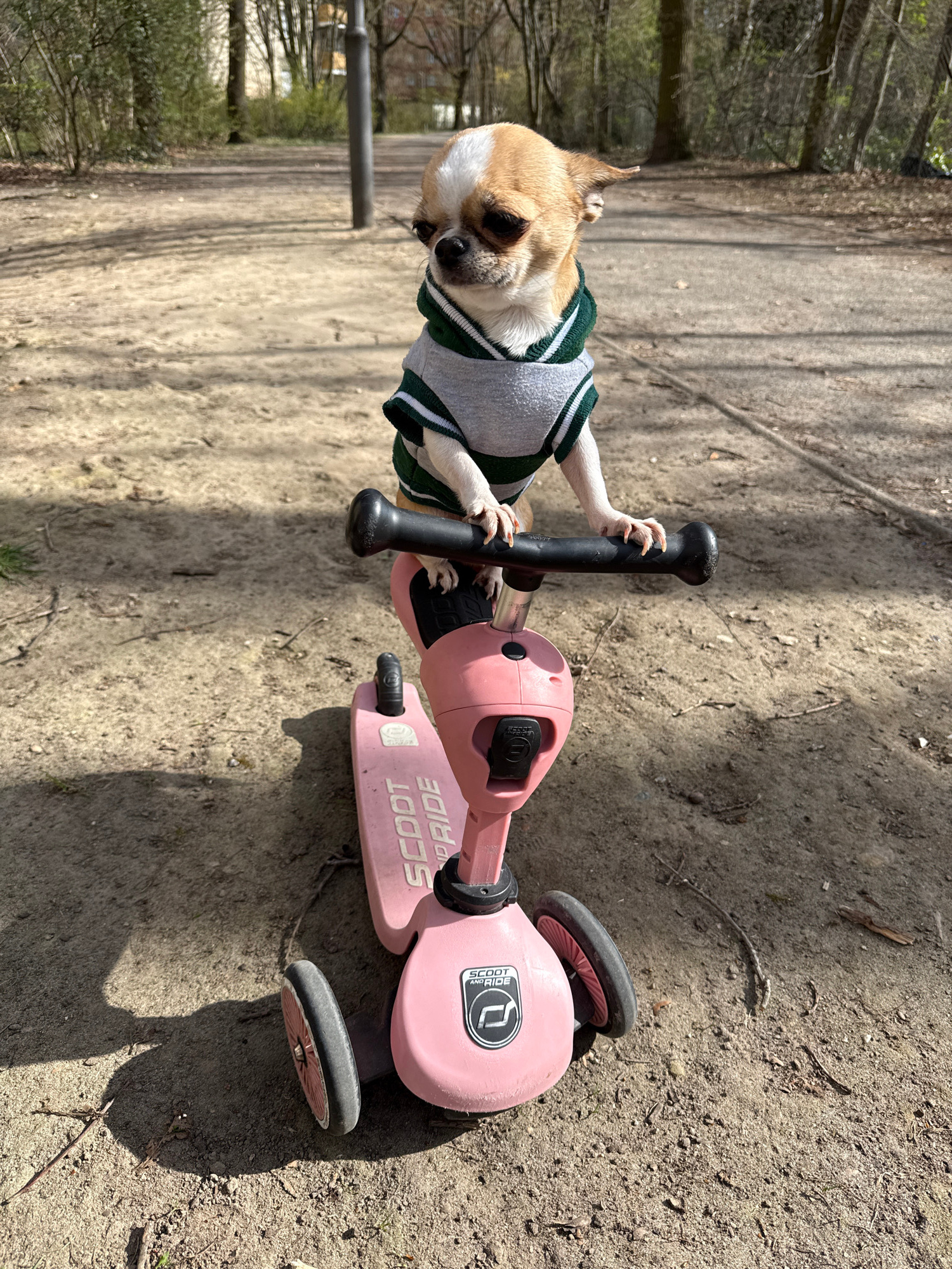 The image displays a small Chihuahua dog positioned on a pink three-wheeled "SCOOT AND RIDE" children's scooter. The scene is set on an unpaved dirt path within a park or wooded area in Berlin, Germanβ¦read more