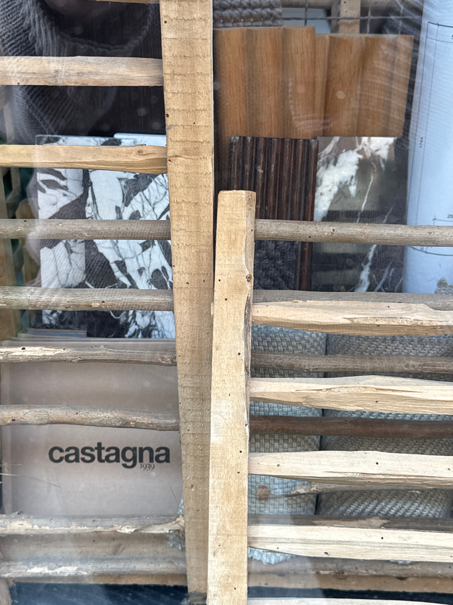A display window features a rustic wooden frame in the foreground, composed of irregularly shaped, pale wooden slats arranged vertically and horizontally. Through the frame, various material samples a…read more