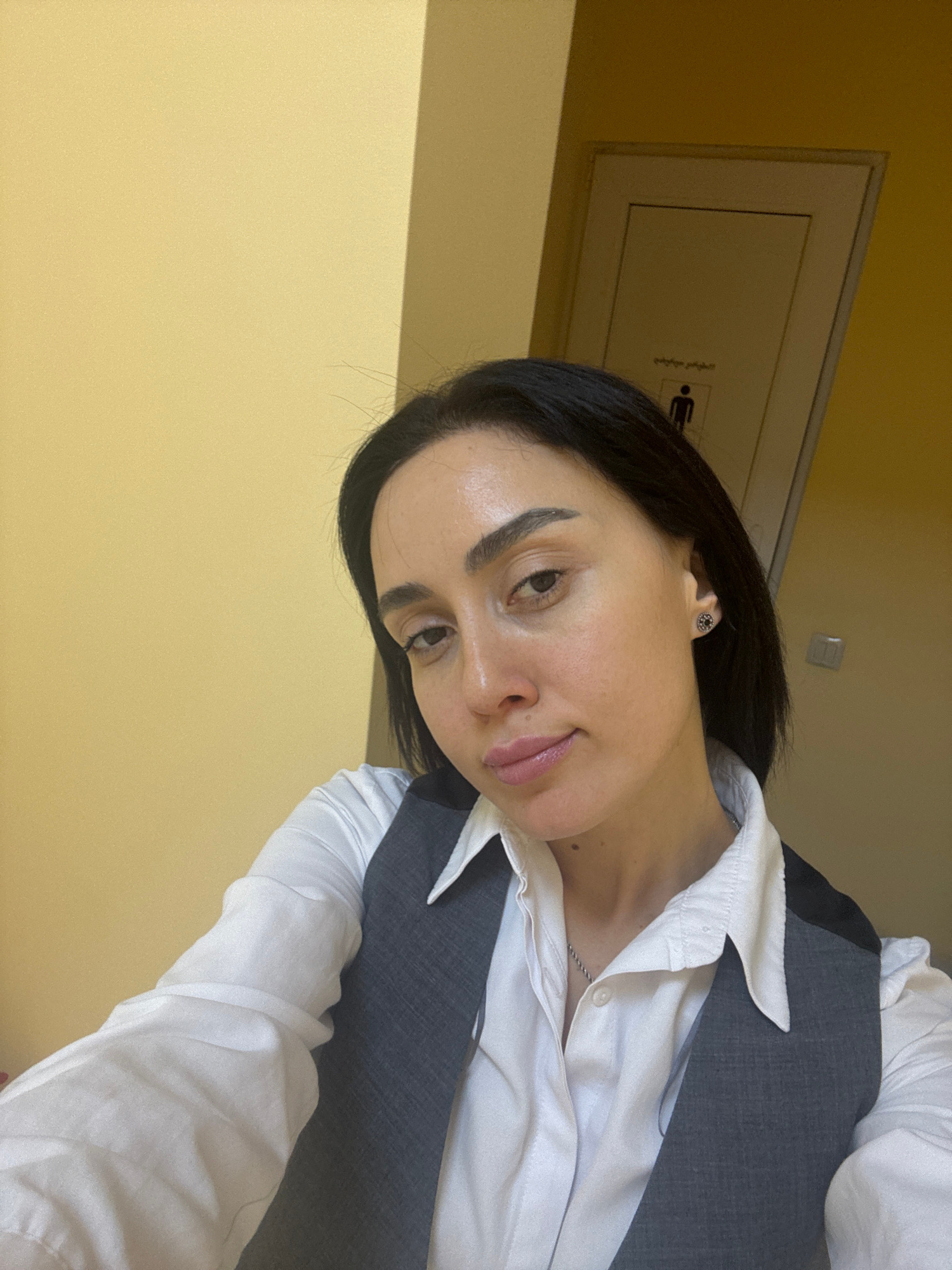 A woman is photographed indoors with a light yellow wall as the background. The room appears to be a public space, as a door with a restroom symbol is visible on the wall. The woman has dark hair and…read more