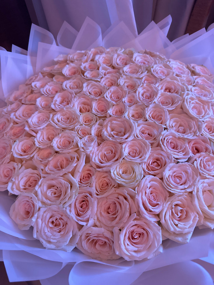 A voluminous bouquet of pale pink roses, tightly clustered together, creates a dense floral arrangement. The roses exhibit delicate petals, spiraling to form classic rose blooms. The bouquet is wrappe…read more