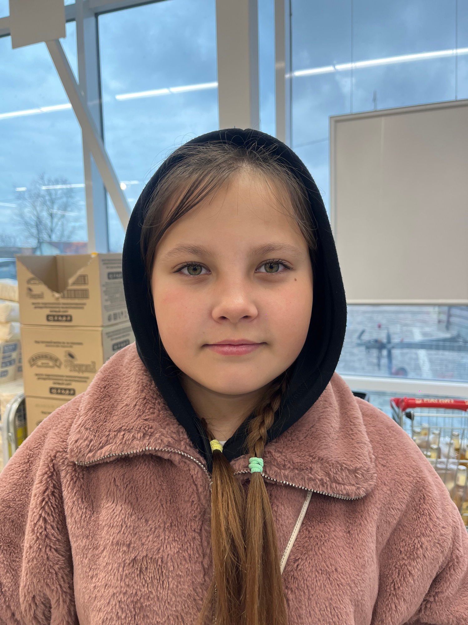A young girl with light brown hair and green eyes is wearing a black hoodie and a pink, fuzzy jacket. Her hair is partially braided and secured with green and yellow hair ties. She appears to be insid…read more