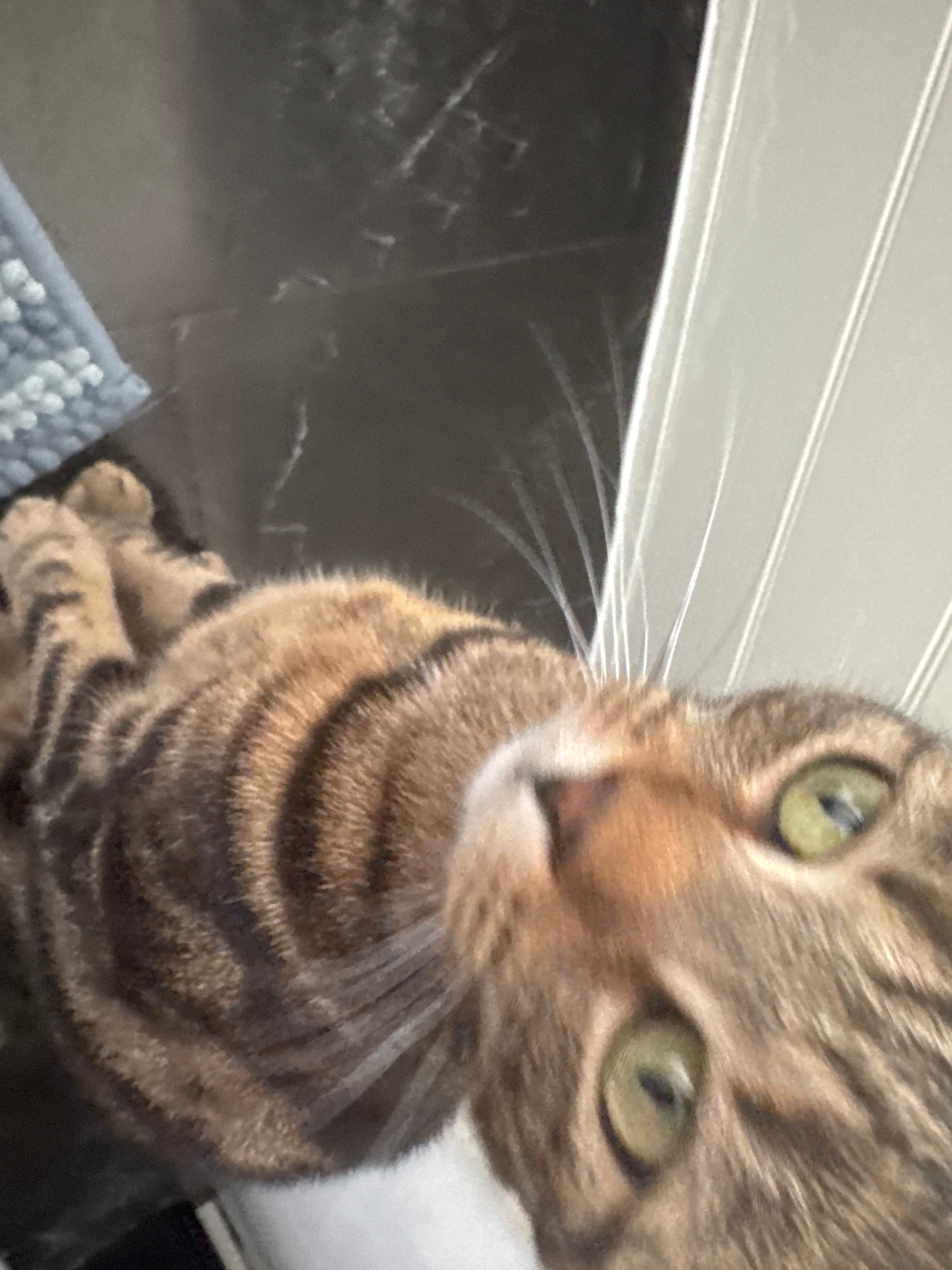 A close-up photograph shows a brown tabby cat with green eyes looking directly at the camera. The cat is positioned slightly off-center, with its head tilted to the right. Visible in the background ar…read more