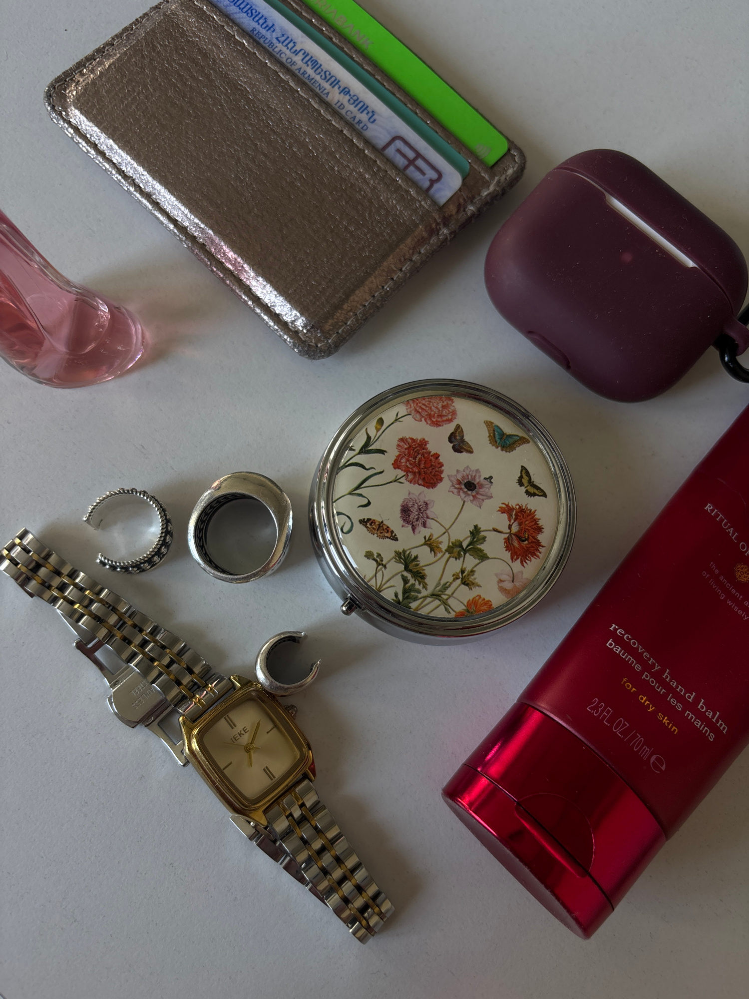 The image depicts a collection of personal items arranged on a light-colored surface. A metallic wallet holds cards, including an ID card from the Republic of Armenia. A maroon-colored Airpod case, a…read more