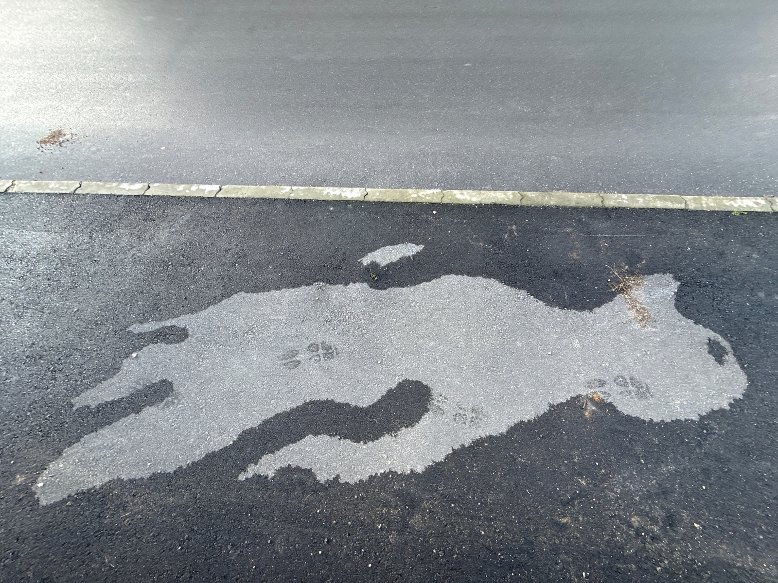 The image shows a patch of wet asphalt on a road surface. The wet area is irregularly shaped, appearing lighter gray against the darker, dry asphalt. Paw prints are visible within the wet area. A conc…read more