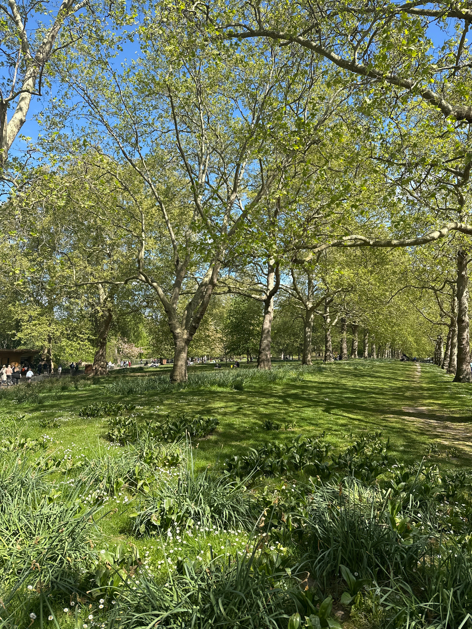 The image depicts a verdant landscape, likely a park or avenue in London, United Kingdom. A row of mature trees with light green foliage lines the left side of the frame, their branches reaching towar…read more