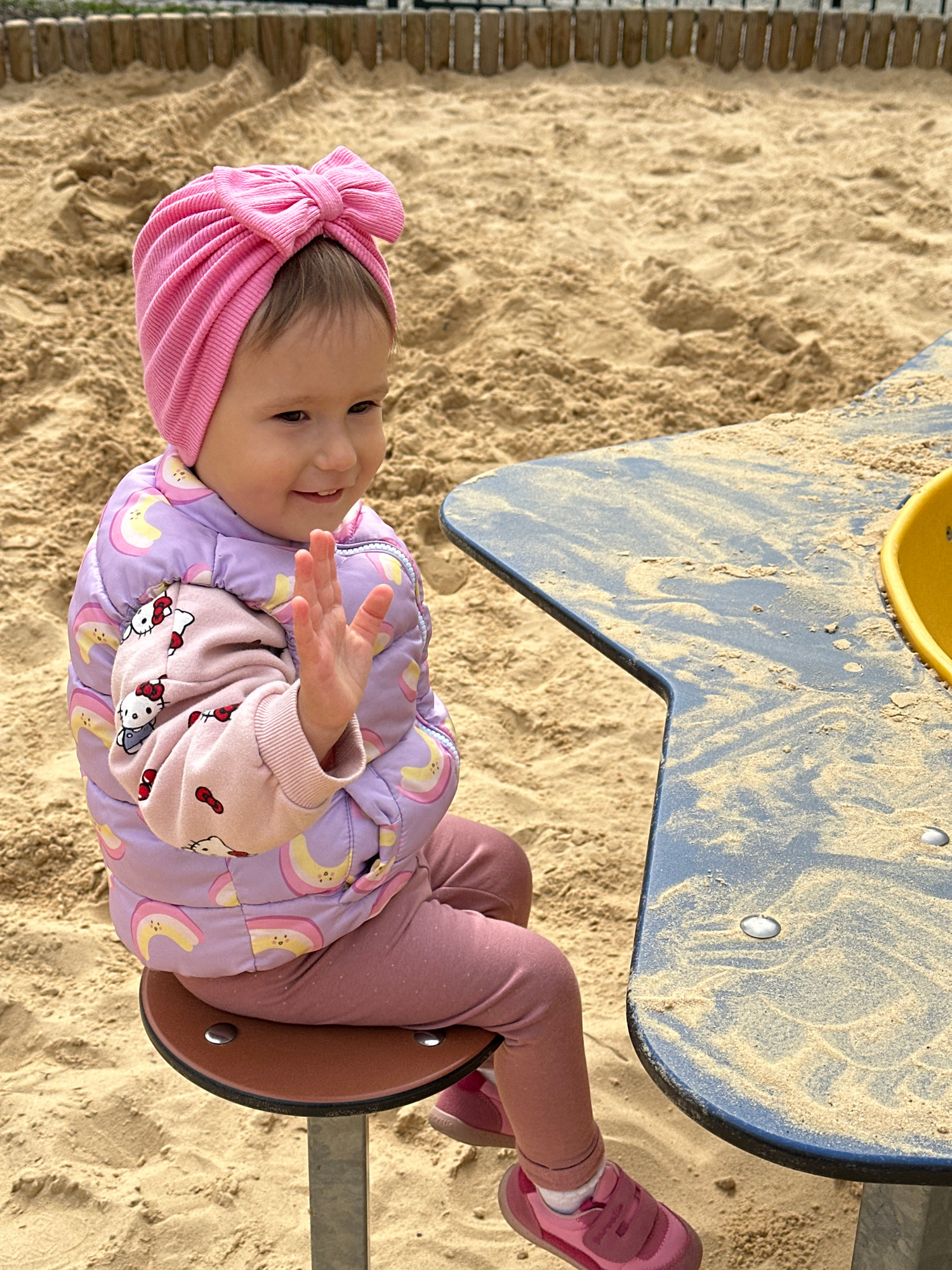 A baby lies in a sandbox on a playground, presumably in the city of Wisła, Poland. The baby wears a pink turban-style hat with a bow, a purple and pink jacket with rainbow designs, a pink shirt with a…read more