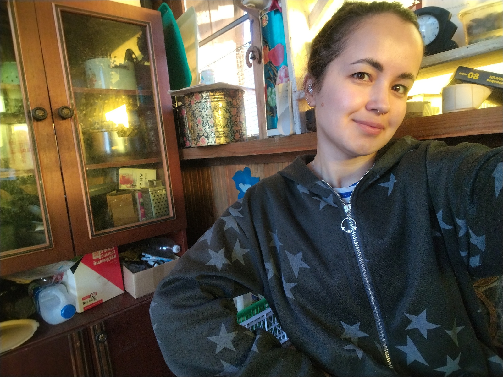 A selfie shows a woman with her hair pulled back, wearing a dark gray hoodie with light gray stars, and with multiple piercings in her ear and a septum piercing. She is smiling slightly at the camera.β¦read more