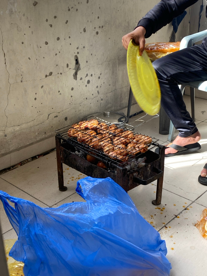 The image depicts an outdoor barbecue scene in what is identified as Khan Yunis, Palestinian Territory. In the foreground, a rusted, rectangular metal charcoal grill with four legs holds a metal grate…read more